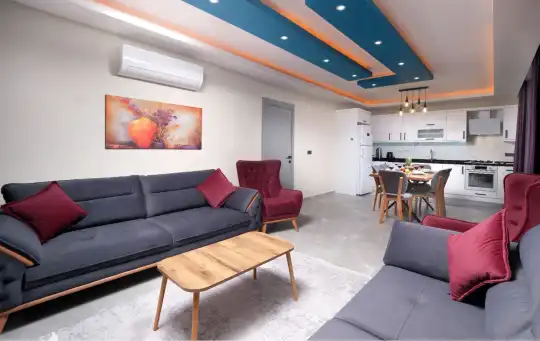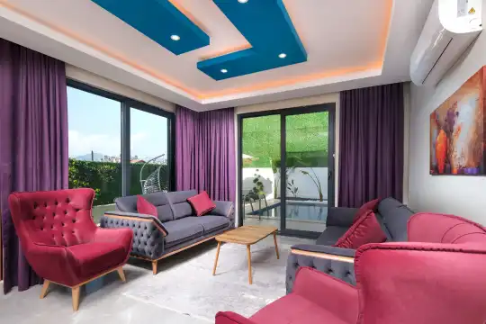 • Salon: Geniş ve ferah oturma alanı, açık mutfak, havuz terasına direkt çıkış ve ortak banyo