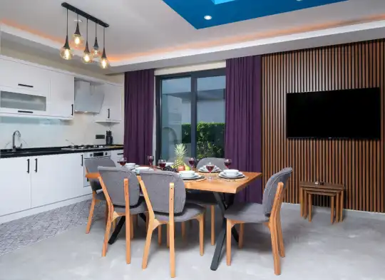 Açık plan mutfağı ve konforlu salonu sayesinde misafirlerin keyifle zaman geçirebileceği iç mekânlar sunan villa, gün boyu güneş alan havuz terasıyla da dinlenme ve eğlenceyi bir arada yaşatır.
