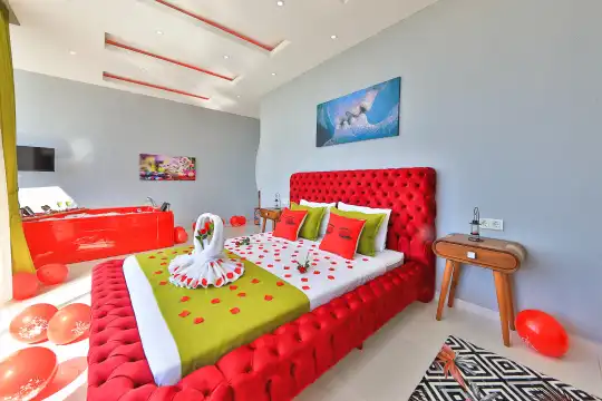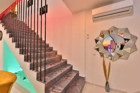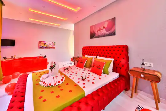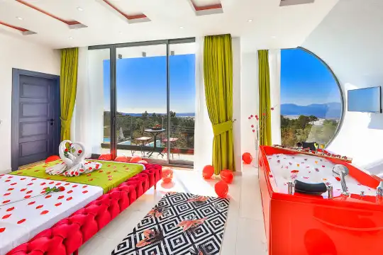 Villamız Kaş/Kalkan tatil beldesinin sakin konumlarından Üzümlü mevkiindeyer almaktadır. Son yılların villa tatili gözdesi olmuş, etrafı ormanlarla çevrili, merkeze araçla 5 dakikada ulaşabildiğiniz konumu ve muhteşem mazarasıyla konaklayanlarına lüks bir tatil imkanı sağlamaktadır. Villa Alyans, 2 kişilik kapasiteye sahip villada 1 yatak odası yer alıyor. Villanın yatak odasında banyosu ve jakuzisi mevcut. Açık mutfağı ve kendine ait bahçesi var. Mutfağında bulaşık makinesi, buzdolabı, ankastre fırın, ve mutfakta ihtiyaç olan hemen hemen bütün gereçler bulunuyor. Villanın bahçesinde özel havuzu mevcut. Barbekü, masa, sandalyeler, şezlonglar ve şemsiyeler bahçe keyfini sınırsız yaşamanıza imkan tanıyor. Salonunda oturma grubu, televizyon, eşyalar bulunurken, tüm odalar için ayrı klima imkanı var.