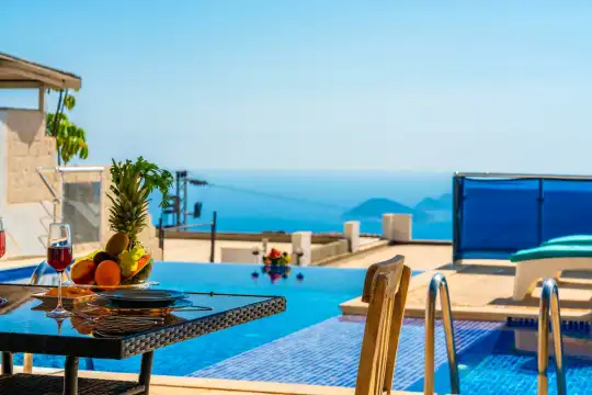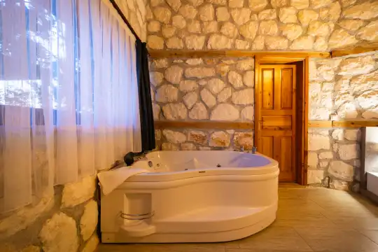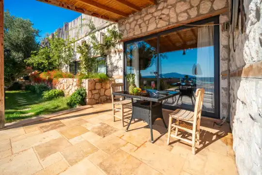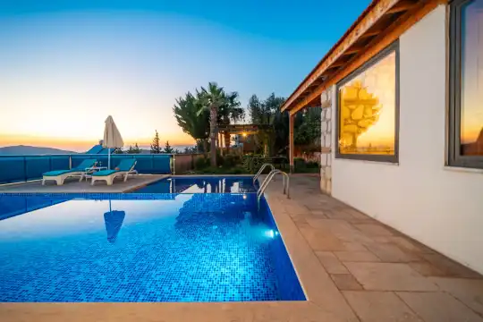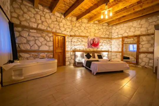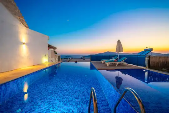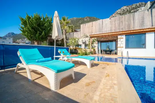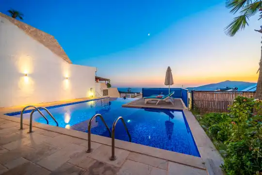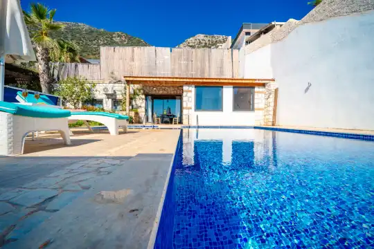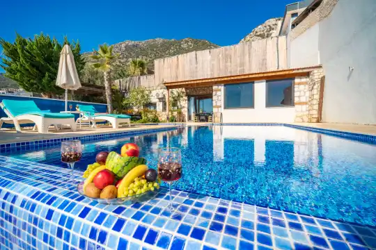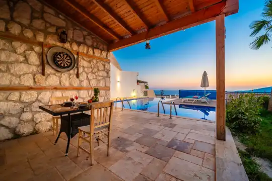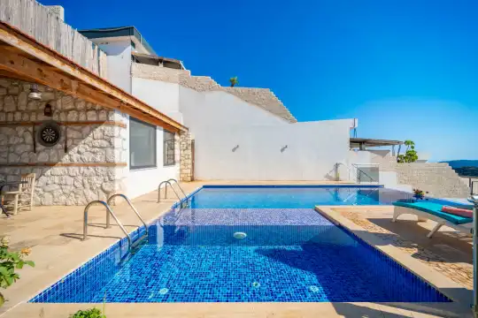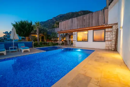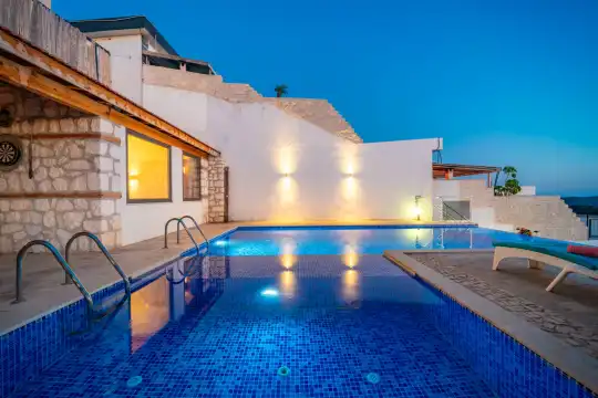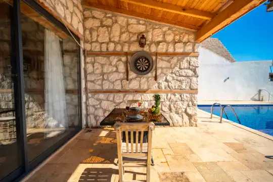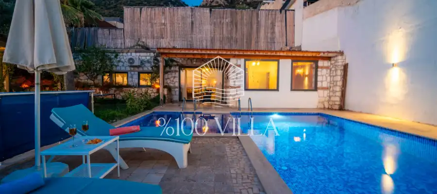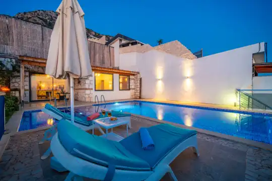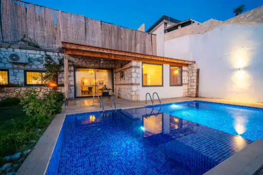 Villa Anahita, Kalkan'ın Kördere mevkiinde yer alan, 1 yatak odalı ve 2 kişilik konaklama kapasiteli balayı villasıdır. Modern ve şık taş mimarisiyle tasarlanan villamızda, konforunuz için bir süit yatak odası ve dinlenmenizi sağlayacak bir jakuzi bulunmaktadır. Ayrıca, keyifli zaman geçirebilmeniz için sauna ve Türk hamamı mevcuttur. Havuz alanında yemek masası, oturma grubu ve barbekü yer almakta olup, perdeleme sistemi sayesinde havuz alanı tamamen korunaklıdır.