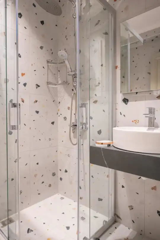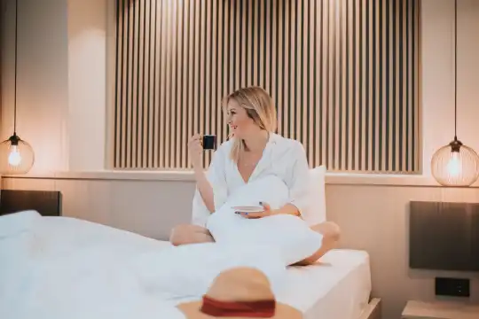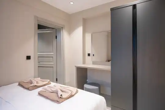 - Yatak Odası: İki tek kişilik yatak, ebeveyn banyosu