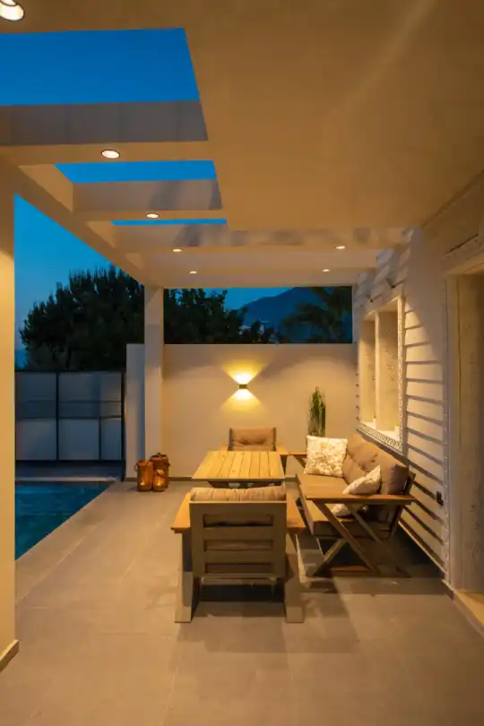 - Oturma Odası: Havuz terasına açılan ferah bir alan, modern oturma grubu