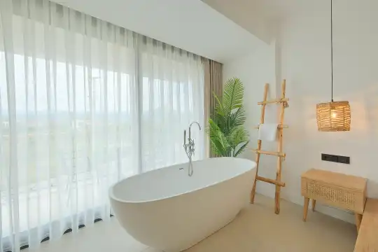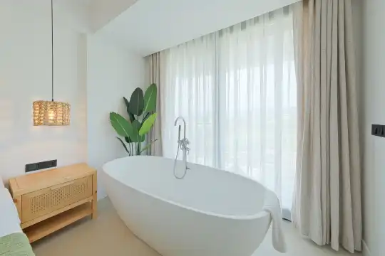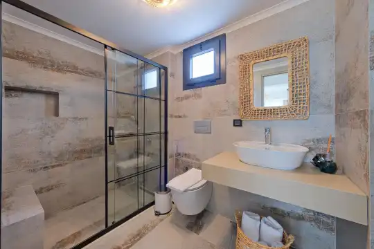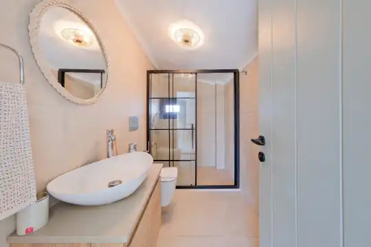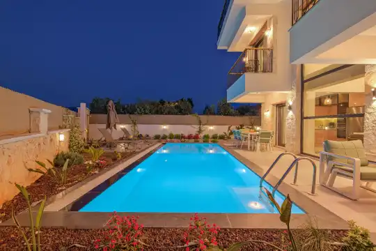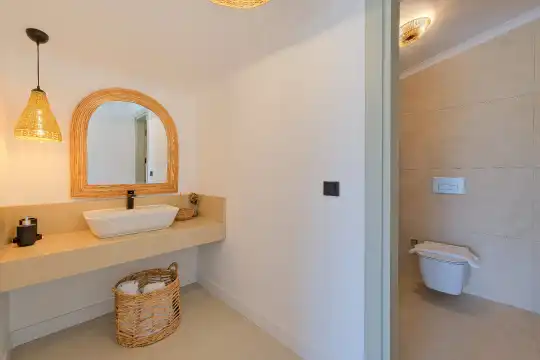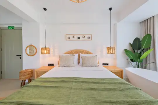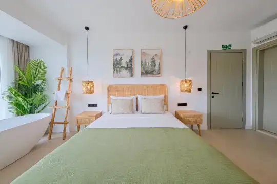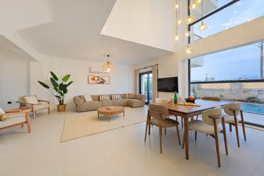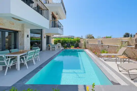 Bohem ve sade çizgilerle tasarlanmış iç mekan, tatilinize farklı bir atmosfer katacak. Modern ve şık detaylarla donatılmış villa, bahçe ve havuz alanıyla sadece size özel bir tatil sunuyor. Bu özel alan, geniş bir şezlong takımı, rahat oturma grubu ve barbekü alanı ile konforlu bir açık hava yaşamı sağlıyor.
