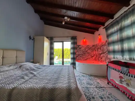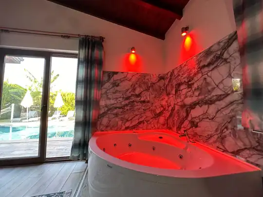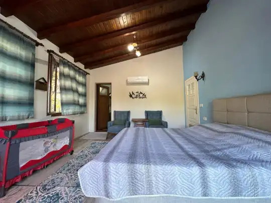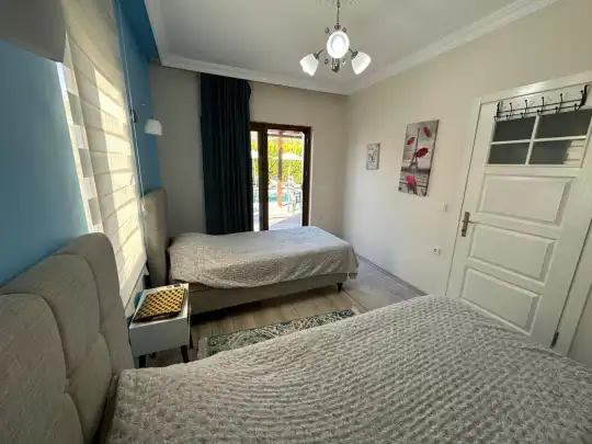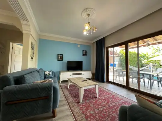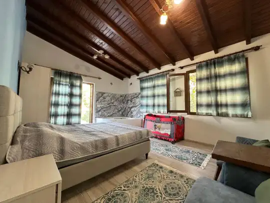 Fethiye´nin en gözde tarihi ve turistik yeri sayılan, eski tarihi Rum evlerine ev sahipliği yapan Kayaköy mevkisinde konumlanmaktadır. Yeşillikler arasında geniş bir bahçeye sahiptir. Korunaklı havuz ve bahçe alanı ile dış gözlerden uzak tatilini geçirmek isteyenler ve mutaassıp aileler için oldukça ideal kiralık villa seçenekleri arasında yer almaktadır. Villamız 4 kişilik kapasiteye sahiptir ve 2 yatak odası yer alır. Villanın 2 banyosu ve jakuzisi mevcut. Açık mutfağı ve kendine ait bahçesinde bir havuzu var. Mutfağında bulaşık makinesi, buzdolabı, ankastre fırın, tost makinesi ve mutfakta ihtiyaç olan hemen hemen bütün gereçler bulunuyor. Barbekü, masa, sandalyeler, şezlonglar ve şemsiyeler bahçe keyfini sınırsız yaşamanıza imkan tanıyor. Salonunda oturma grubu, televizyon, eşyalar bulunurken, tüm odalar için ayrı klima imkanı var.