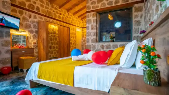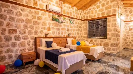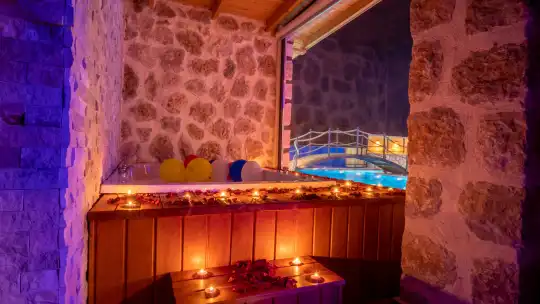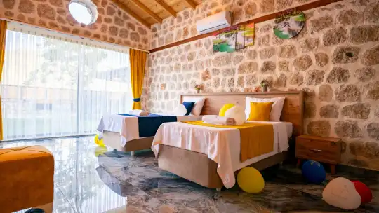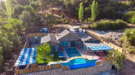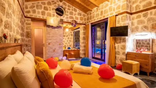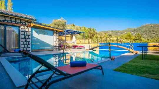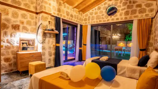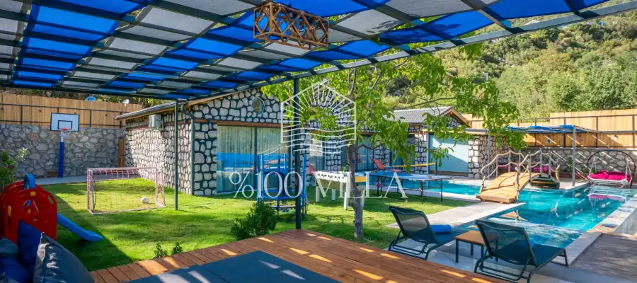 Villa Big Boss, Kalkan İslamlar’dabulunan taş mimarili ile özenle dekore edilmiş 2 yatak odalı, yeşillikler içinde özel muhafazakar havuzlu, masa tenisi, şömine, langırt, çocuklar için düşünülmüş oyun parkı, salıncak, mini futbol kalesi, küçük basket potası, oturma köşkü, tranbolin, masa tenisi, langırt, minyatür kale, havuzda voleybol filesi, bbq, tavla, satranç, domino, sauna ve oda içerisinde jakuzi bulunan villamız bölgenin en modern villalarından olup muhafazakar balayı çiftine fiyata uygun, lüks bir Kiralık Balayı Villasıdır. Villa Big Boss geniş bir bahçe içerisinde yapılmış olup etrafında herhangi bir yerleşim olmadığı için tam korunaklı bir havuza sahiptir.