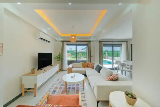 - Havuz terasına açılan modern ve konforlu oturma odası.