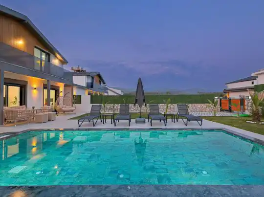 - Bahçe & Havuz Alanı: Geniş ve ferah bahçede şezlonglar, oturma grubu, salıncak ve barbekü alanı.