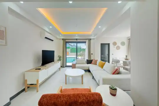 • Havuz terasına açılan modern ve konforlu oturma odası.
