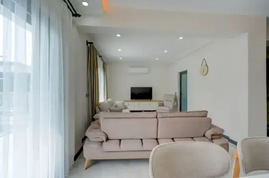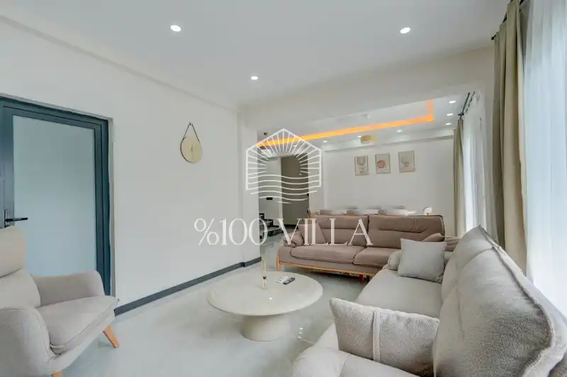 - Havuz terasına açılan modern ve konforlu oturma odası.