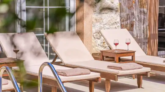 Havuz Terası: Korunaklı yüzme havuzu, şezlong, oturma grubu ve barbekü alanı