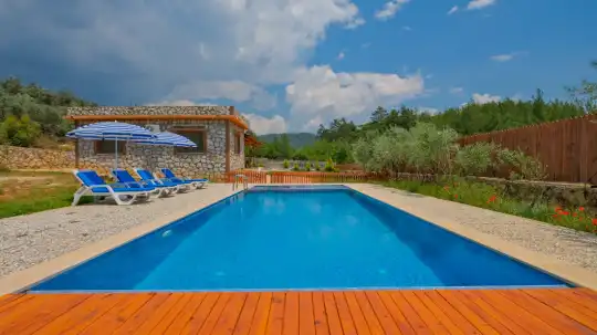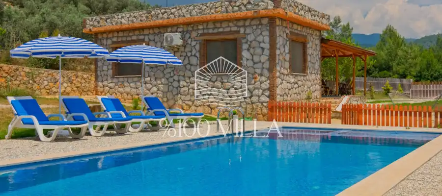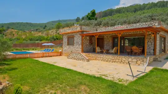 Geniş havuz ve bahçe alanına sahip villada, kapasiteye uygun oturma alanı, şezlong takımı, barbekü ve çocuk oyun alanı; havuz terasına açılan konforlu oturma odası; ihtiyaçlarınızı karşılayacak donanıma sahip mutfağı bulunmaktadır. Bir yatak odasında çift kişilik yatak; diğer yatak odasında iki tek kişilik yatak mevcuttur.