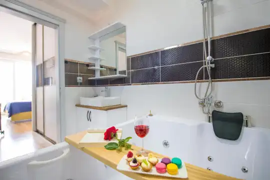 yatak odasında çift kişilik yatak ve yine ebeveyn banyosu,