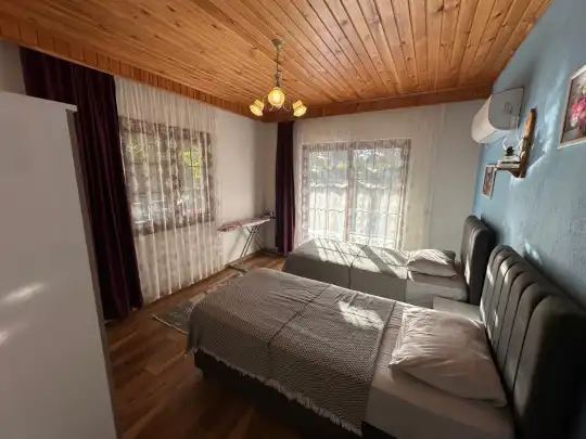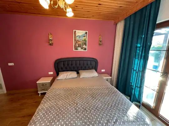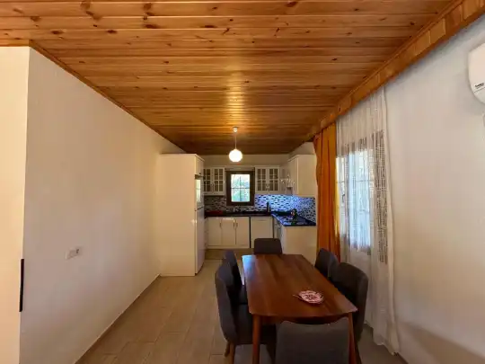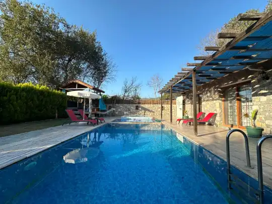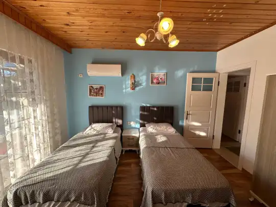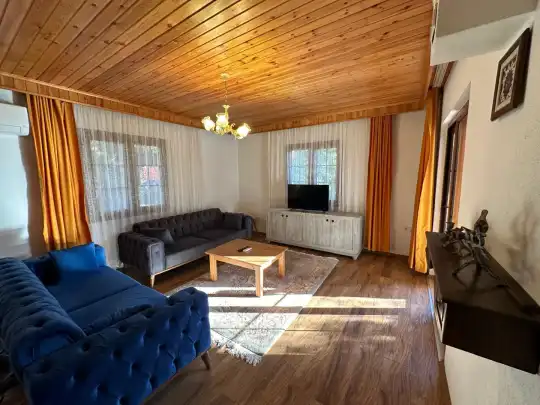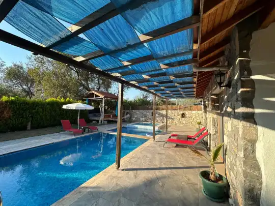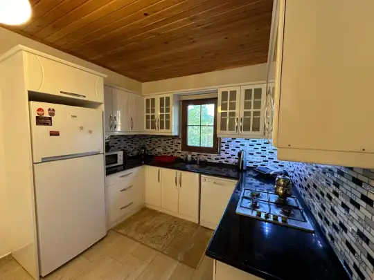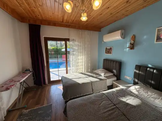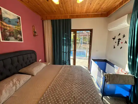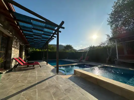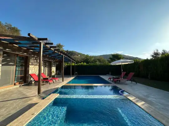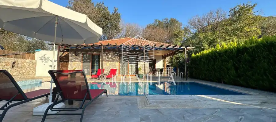 Fethiye´nin en gözde tarihi ve turistik yeri sayılan, eski tarihi Rum evlerine ev sahipliği yapan Kayaköy mevkisinde konumlanmaktadır. Yeşillikler arasında geniş bir bahçeye sahiptir. Korunaklı havuz ve bahçe alanı ile dış gözlerden uzak tatilini geçirmek isteyenler ve mutaassıp aileler için oldukça ideal kiralık villa seçenekleri arasında yer almaktadır. Villamız 4 kişilik kapasiteye sahiptir ve 2 yatak odası yer alır. Villanın 2 banyosu ve jakuzisi mevcut. Açık mutfağı ve kendine ait bahçesinde bir havuzu var. Mutfağında bulaşık makinesi, buzdolabı, ankastre fırın, tost makinesi ve mutfakta ihtiyaç olan hemen hemen bütün gereçler bulunuyor. Barbekü, masa, sandalyeler, şezlonglar ve şemsiyeler bahçe keyfini sınırsız yaşamanıza imkan tanıyor. Salonunda oturma grubu, televizyon, eşyalar bulunurken, tüm odalar için ayrı klima imkanı var.