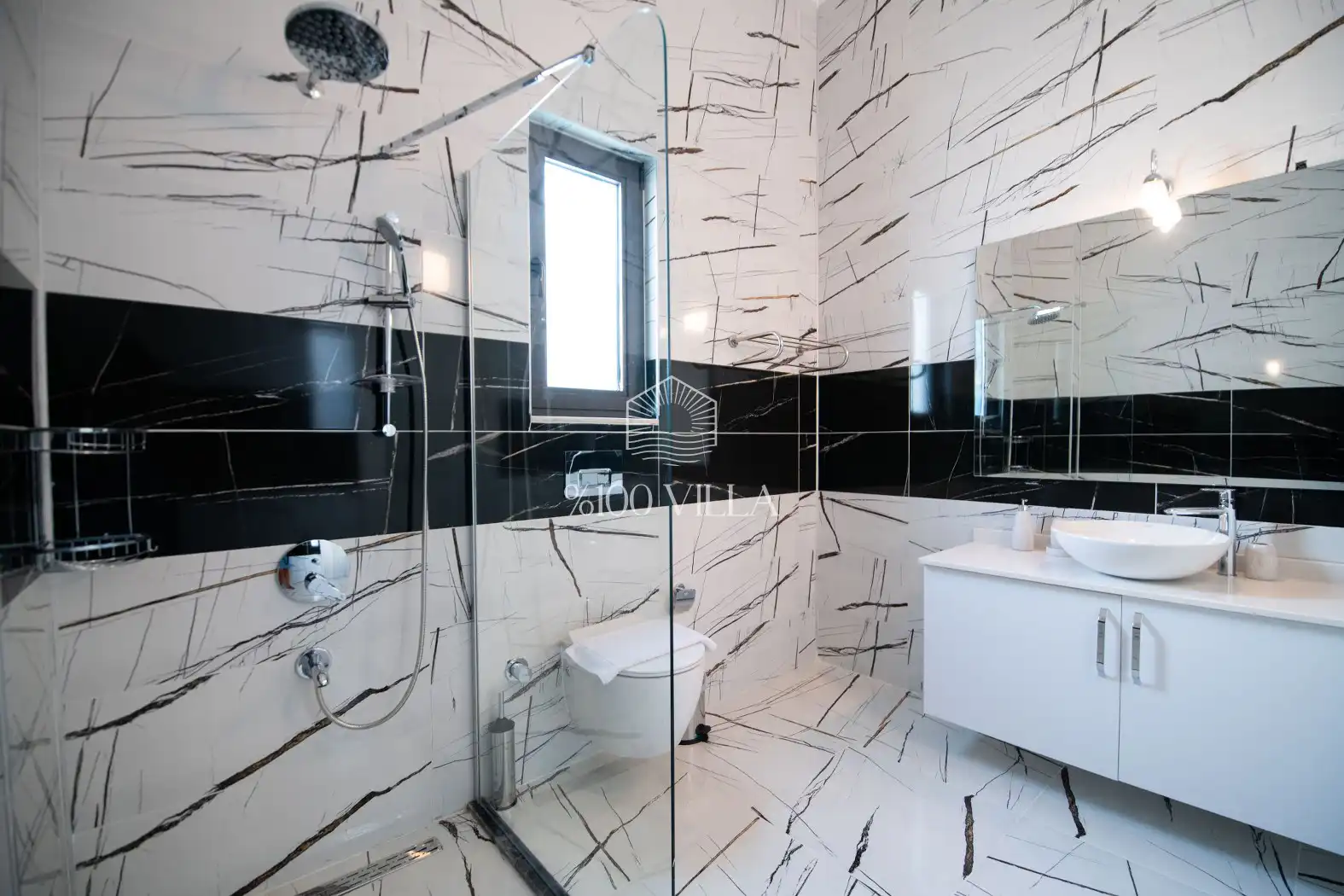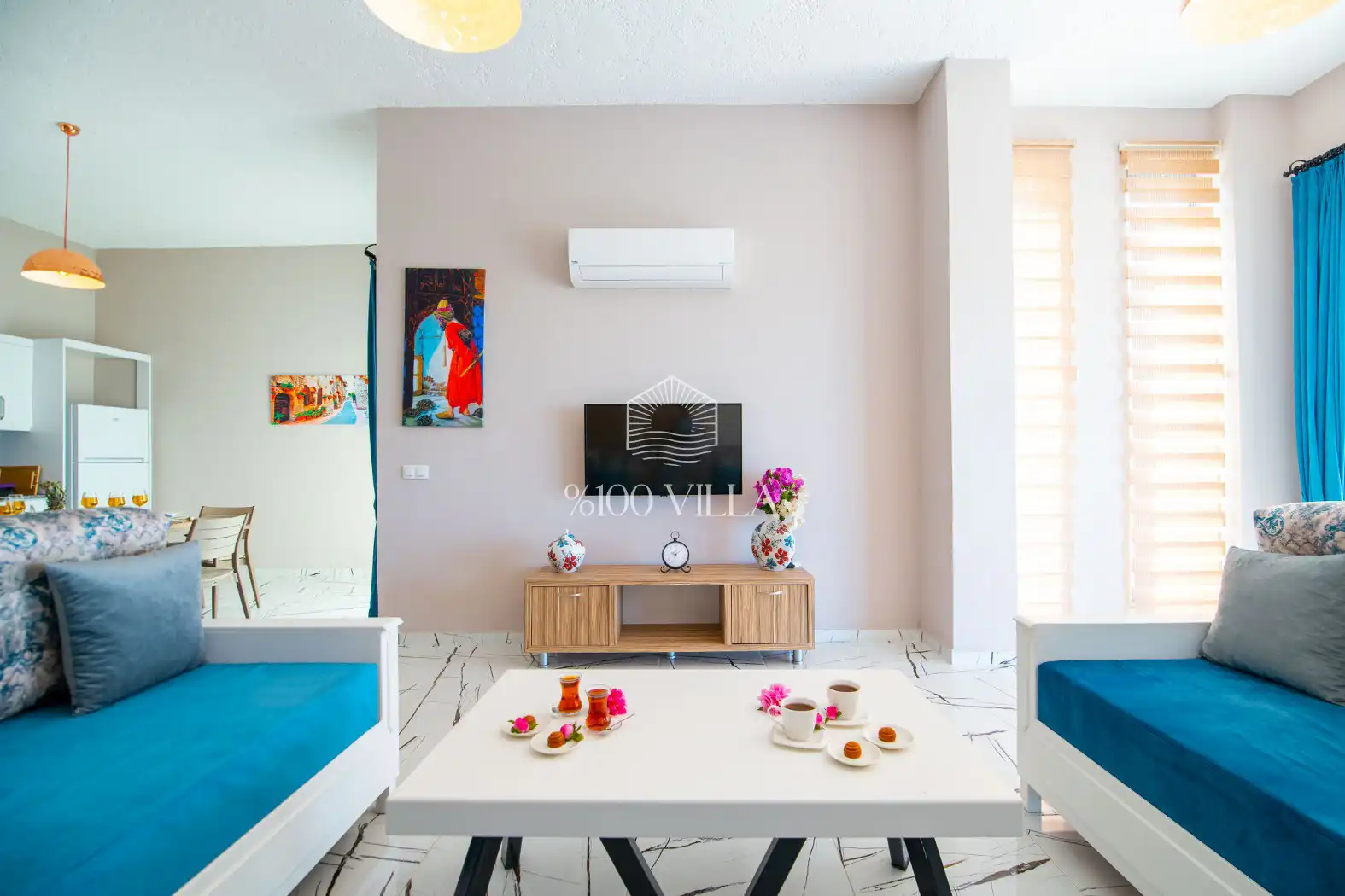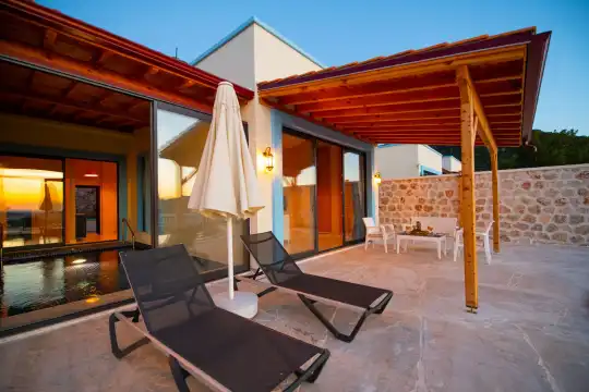 4 kişilik kapasiteye sahip villada 2 yatak odası yer alıyor. Villanın her iki odasında da birer banyosu mevcut.  Açık mutfağı ve kendine ait bahçesi var. Mutfağında bulaşık makinesi, buzdolabı, ankastre fırın, ve mutfakta ihtiyaç olan hemen hemen bütün gereçler bulunuyor. Villanın bahçesinde özel havuzu mevcut. Barbekü, masa, sandalyeler, şezlonglar ve şemsiyeler bahçe keyfini sınırsız yaşamanıza imkan tanıyor. Salonunda oturma grubu, televizyon, eşyalar bulunurken, tüm odalar için ayrı klima imkanı var. Ayrıca kapalı ısıtmalı havuz ve sauna da mevcuttur.