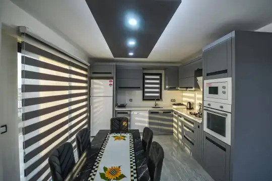 • Mutfak: Modern Amerikan mutfak, buzdolabı, bulaşık makinesi, fırın, ocak seti, mutfak gereçleri.