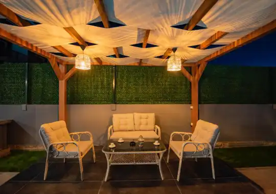 Kapalı bir havuz alanının yanı sıra şezlonglar, oturma grubu, salıncak ve barbekü alanıyla donatılmıştır. Gün boyu güneşin ve temiz havanın tadını çıkarabilirsiniz.
