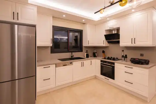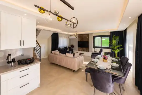 Villanın havuz terasına açılan oturma odası, modern mobilyalarla döşenmiş ve açık mutfak konseptiyle geniş bir kullanım alanı sağlıyor.Donanımlı Yatak Odaları: