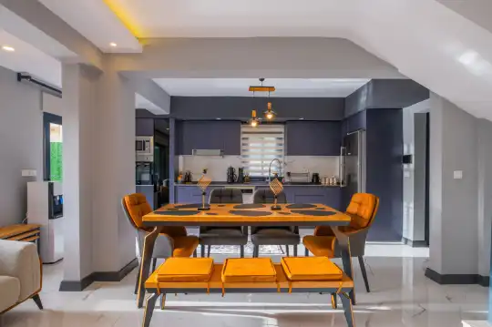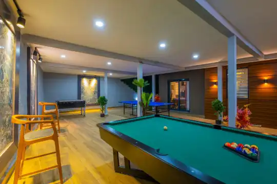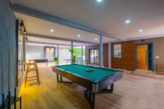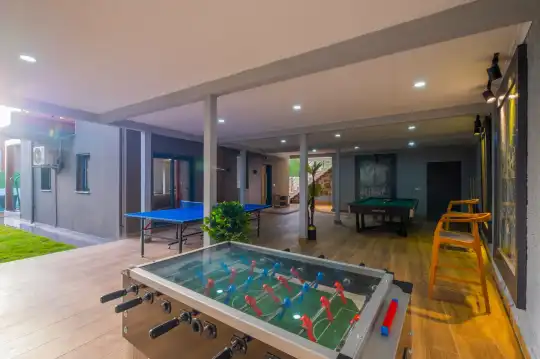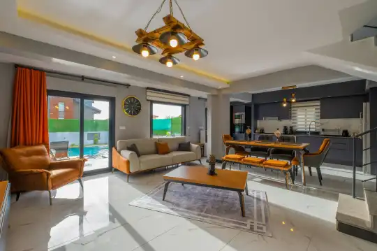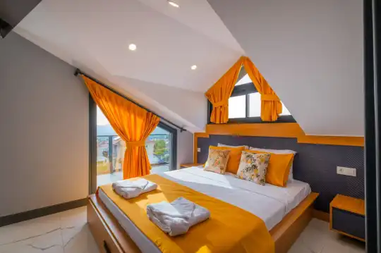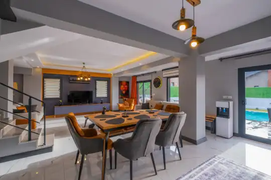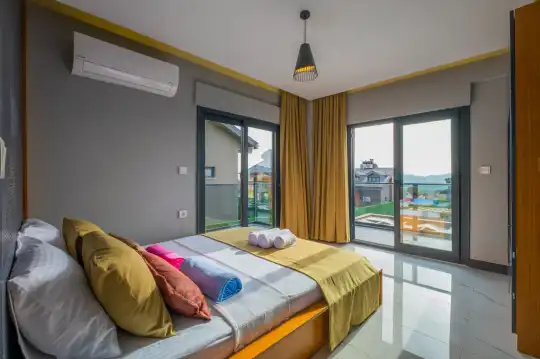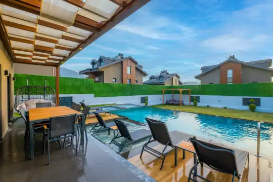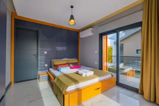 Toplam 8 yatak odasından oluşmuş, 4 kişi konaklama kapasitesine sahiptir. Geniş aileler ve kalabalık arkadaş grupları için oldukça idealdir. Oldukça şık ve modern bir şekilde döşenmiş olan villamızda misafirlerimiz için herşey düşünülmüştür. Havuz terasında bulunan şezlonglarda güneşlenebilir, bahçe masasında muhteşem yemekler yiyebilir, salıncakta sallanıp keyifli dakikalar geçirebilirsiniz.Ayrıca; Çocuk havuzu bulunmaktadır boyutları: 2 m x 2 m’dir. Havuza entegre jakuzi mevcuttur.
