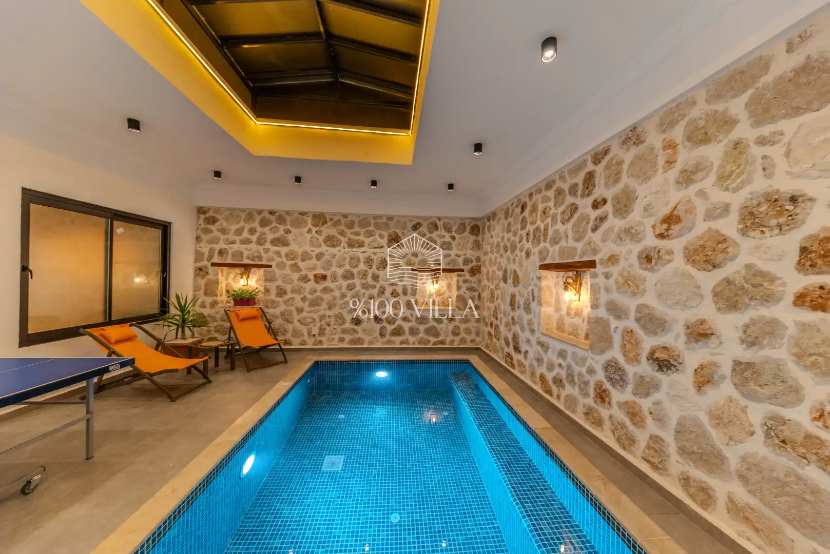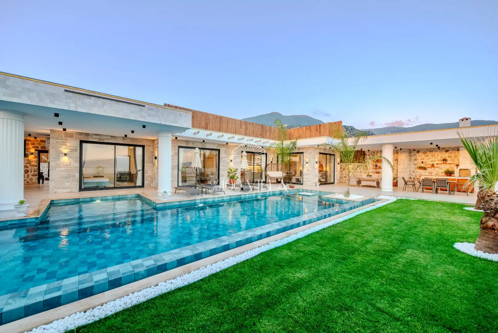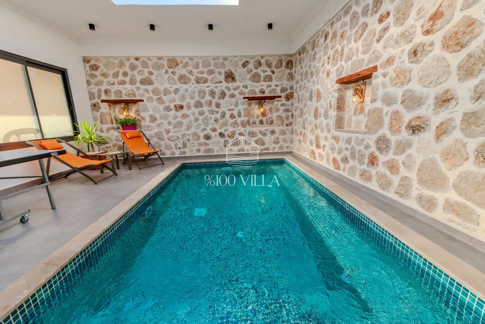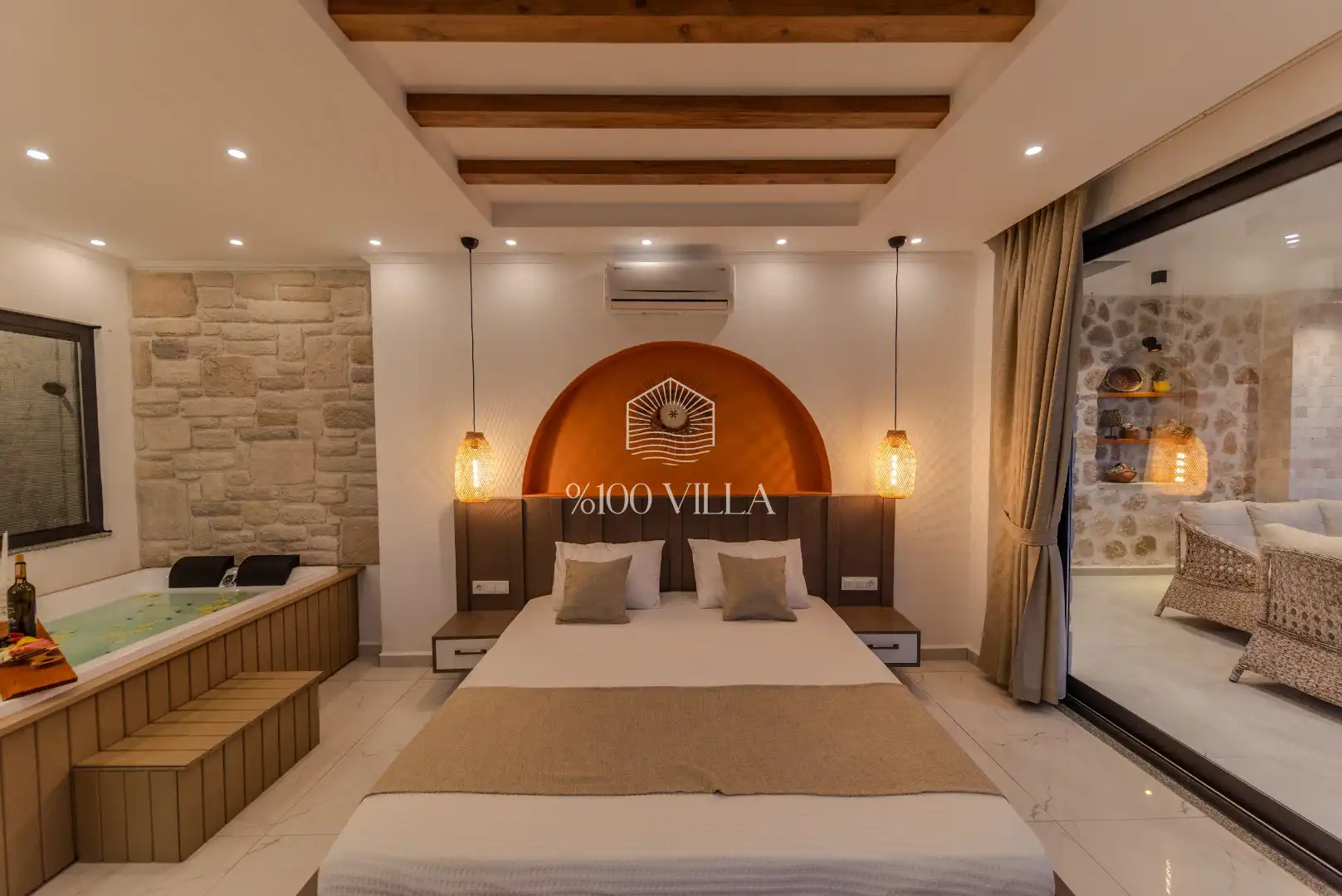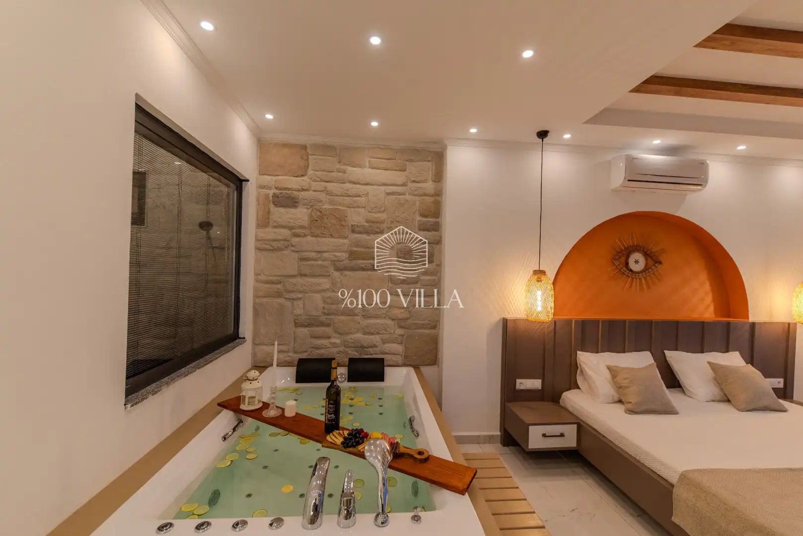 Kalkan Çavdır bölgesinde bulunan villa, 2 yatak odası ile 5 kişilik konaklama kapasitesi sunmaktadır. Mimarisi, kapalı havuz alanı ve çift jakuzisi ile balayı çiftleri ve çekirdek aileler için ideal seçenekler arasında yer almaktadır.