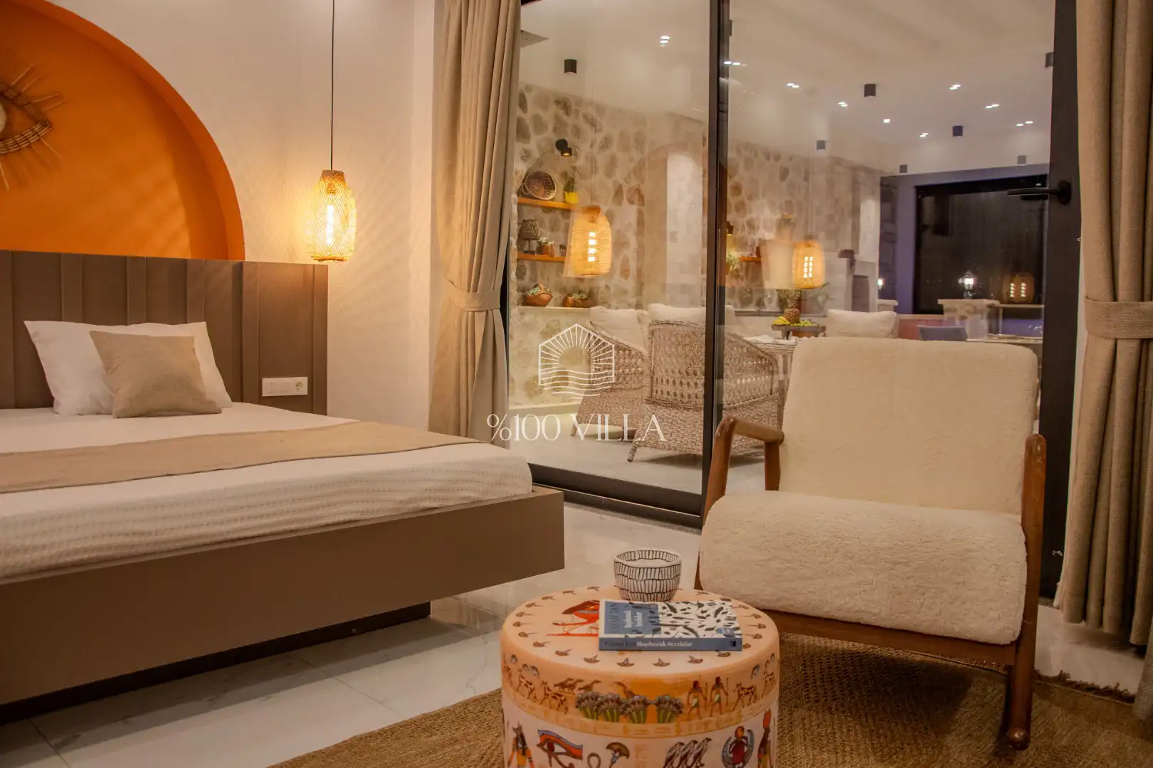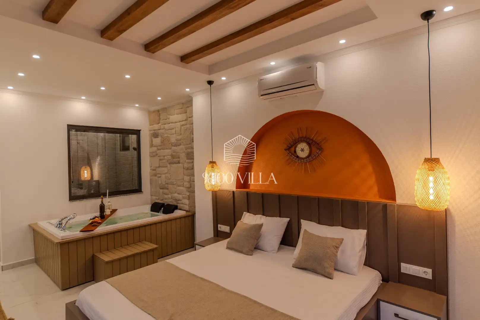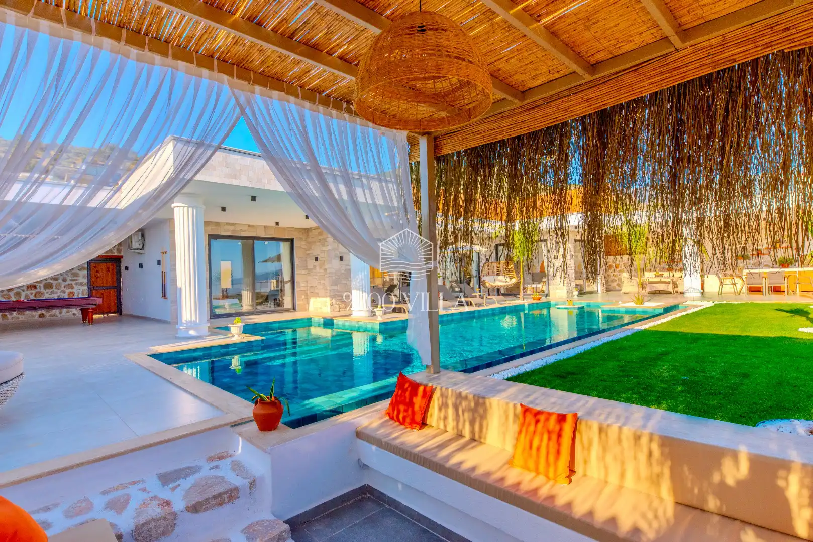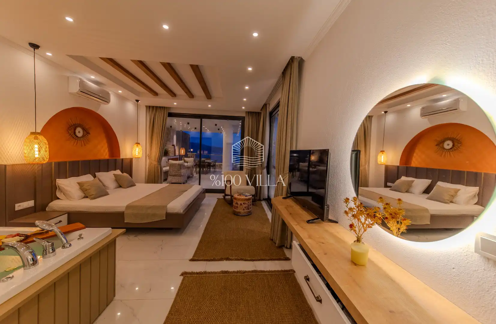 Kalkan Çavdır bölgesinde bulunan villa, 2 yatak odası ile 5 kişilik konaklama kapasitesi sunmaktadır. Mimarisi, kapalı havuz alanı ve çift jakuzisi ile balayı çiftleri ve çekirdek aileler için ideal seçenekler arasında yer almaktadır.