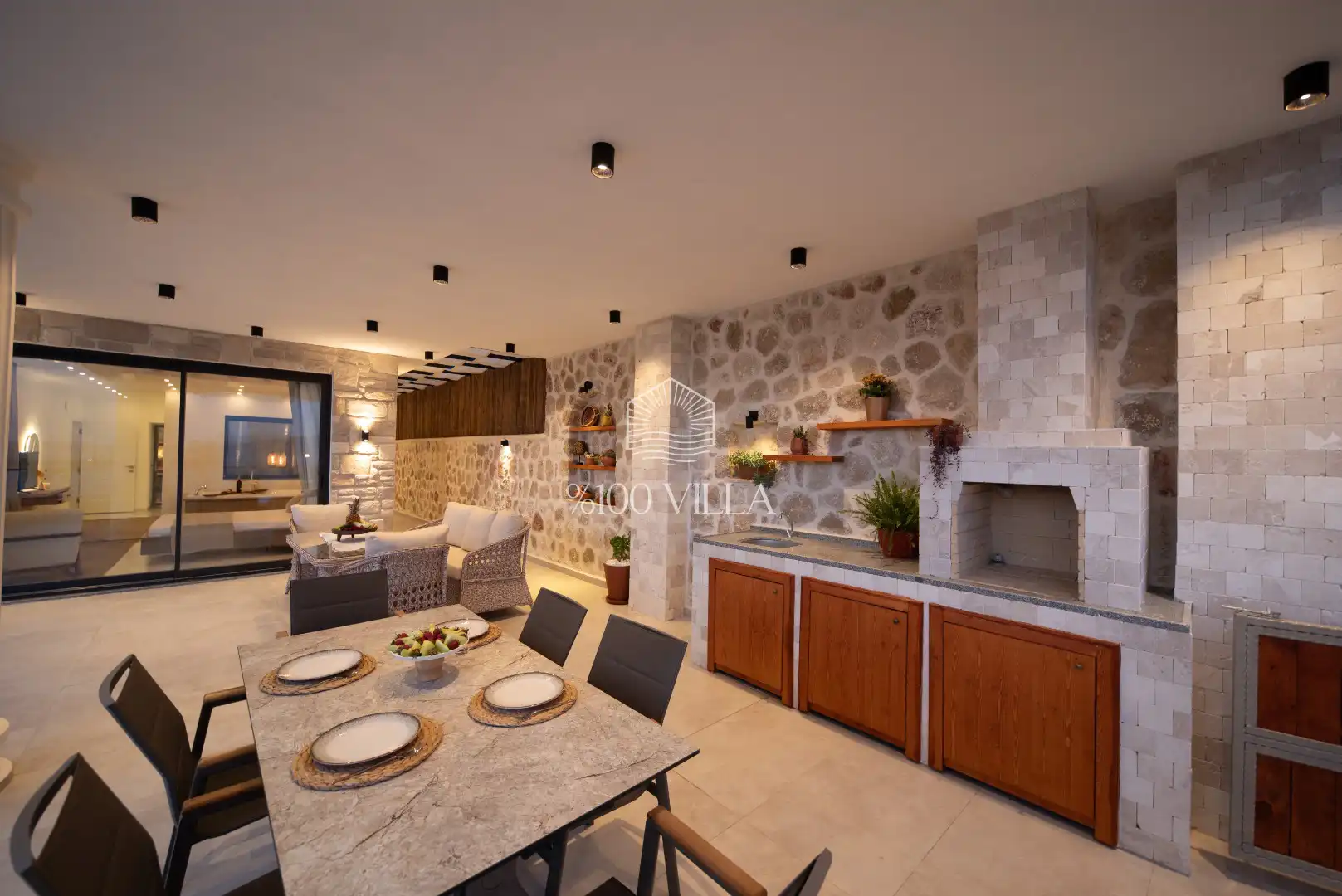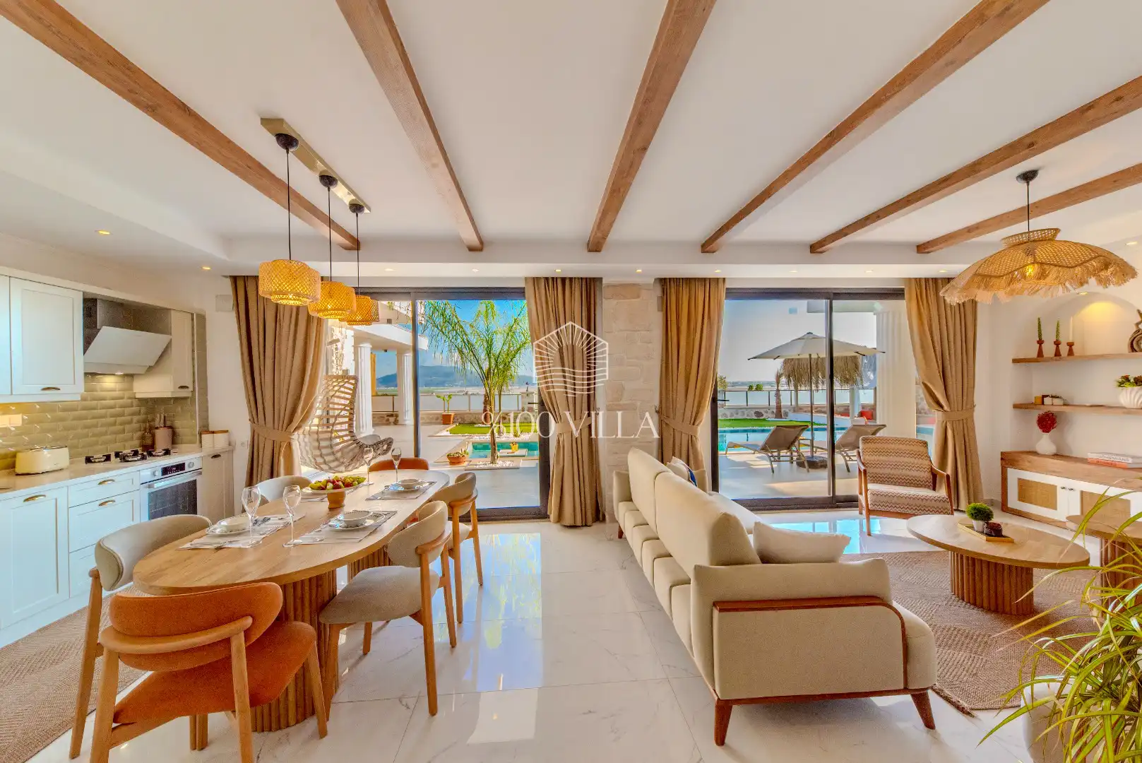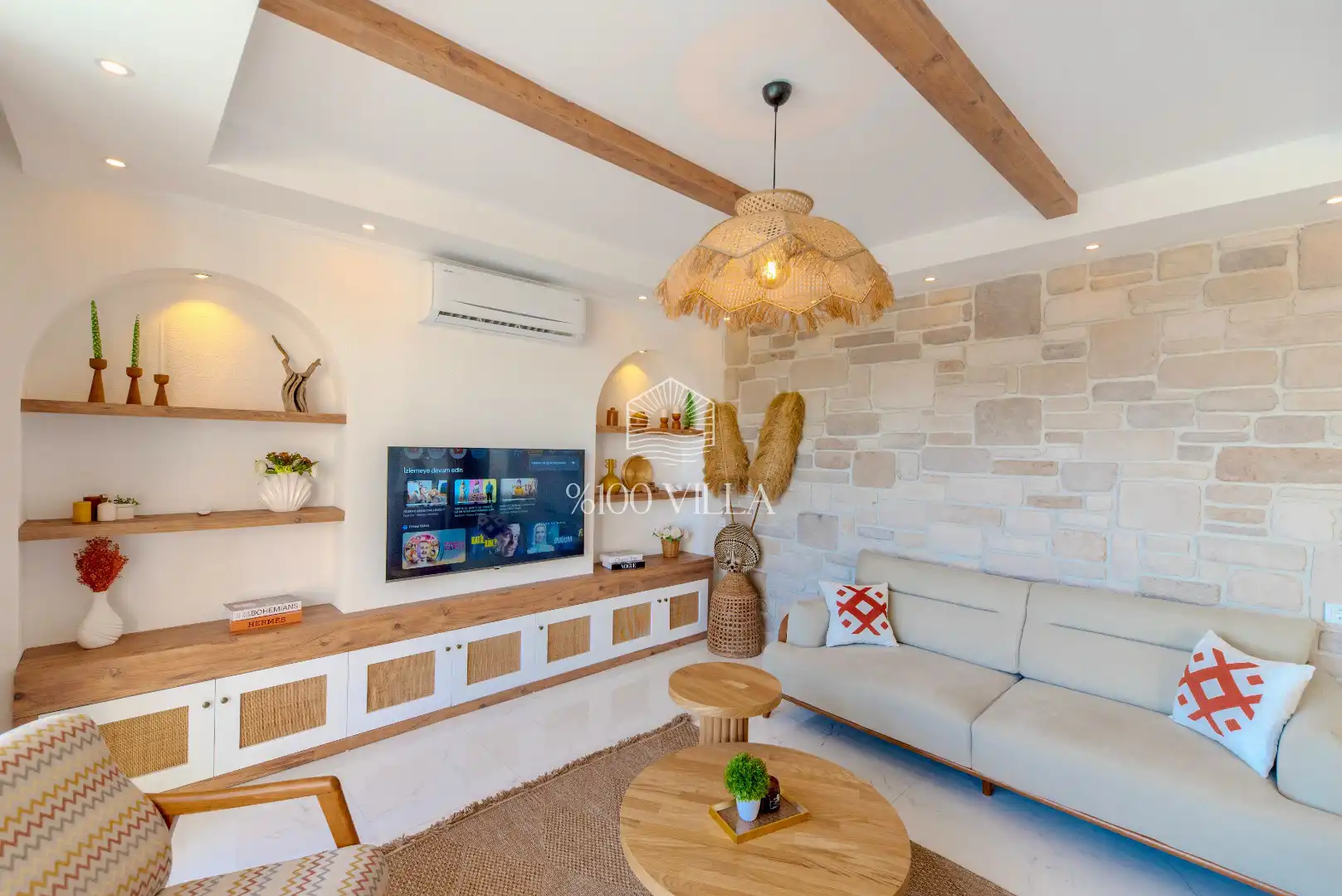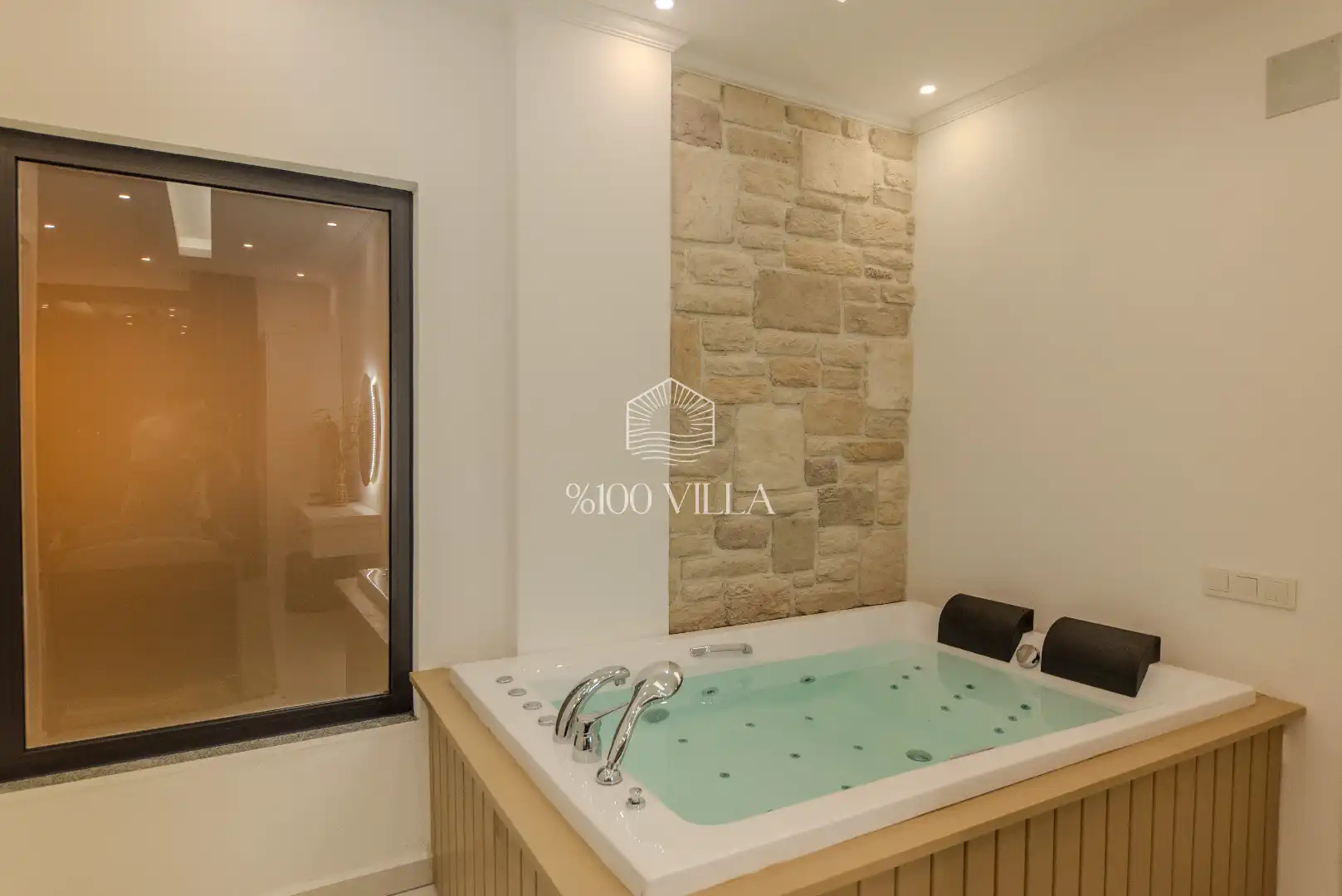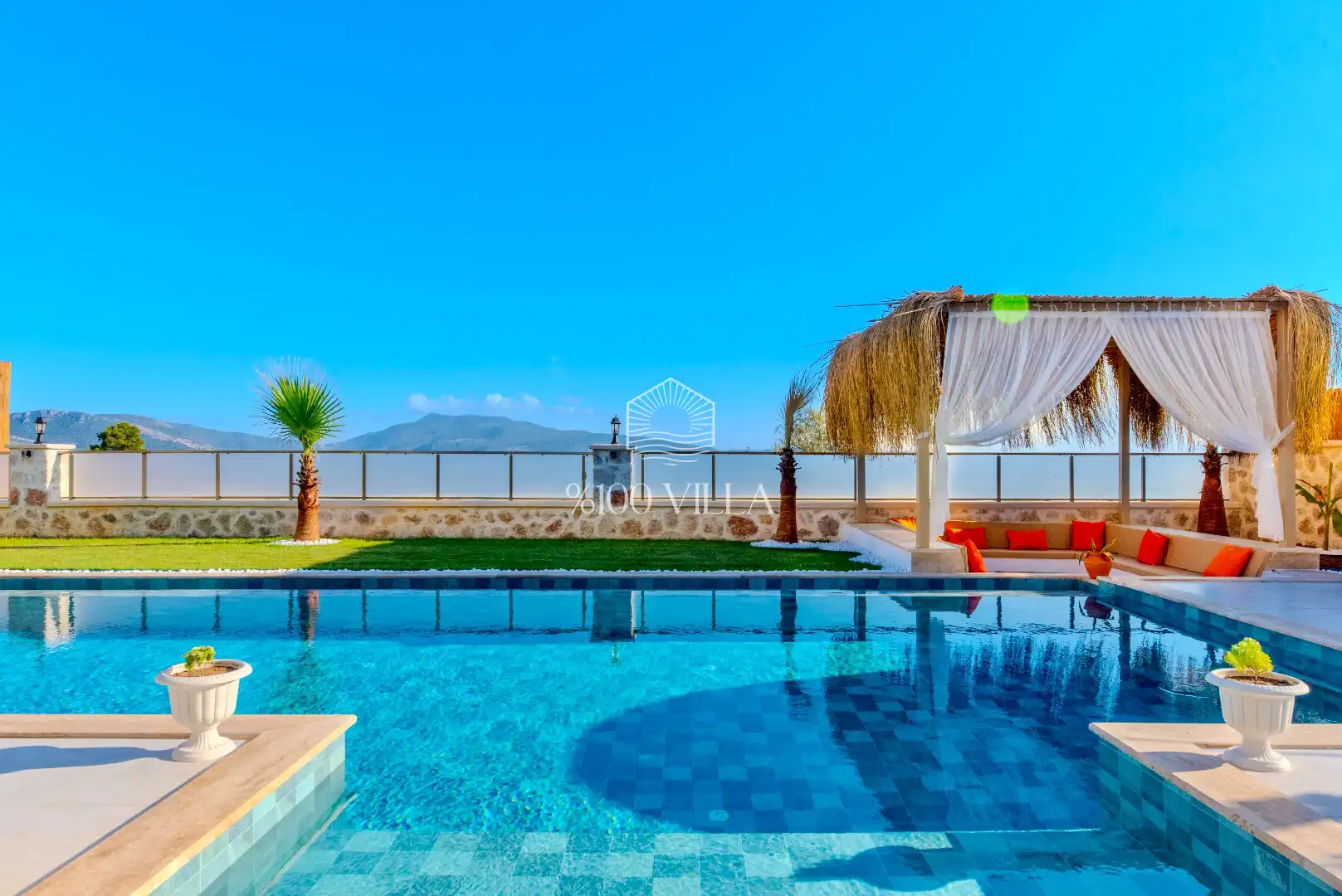Kalkan Çavdır bölgesinde bulunan villa, 2 yatak odası ile 5 kişilik konaklama kapasitesi sunmaktadır. Mimarisi, kapalı havuz alanı ve çift jakuzisi ile balayı çiftleri ve çekirdek aileler için ideal seçenekler arasında yer almaktadır.