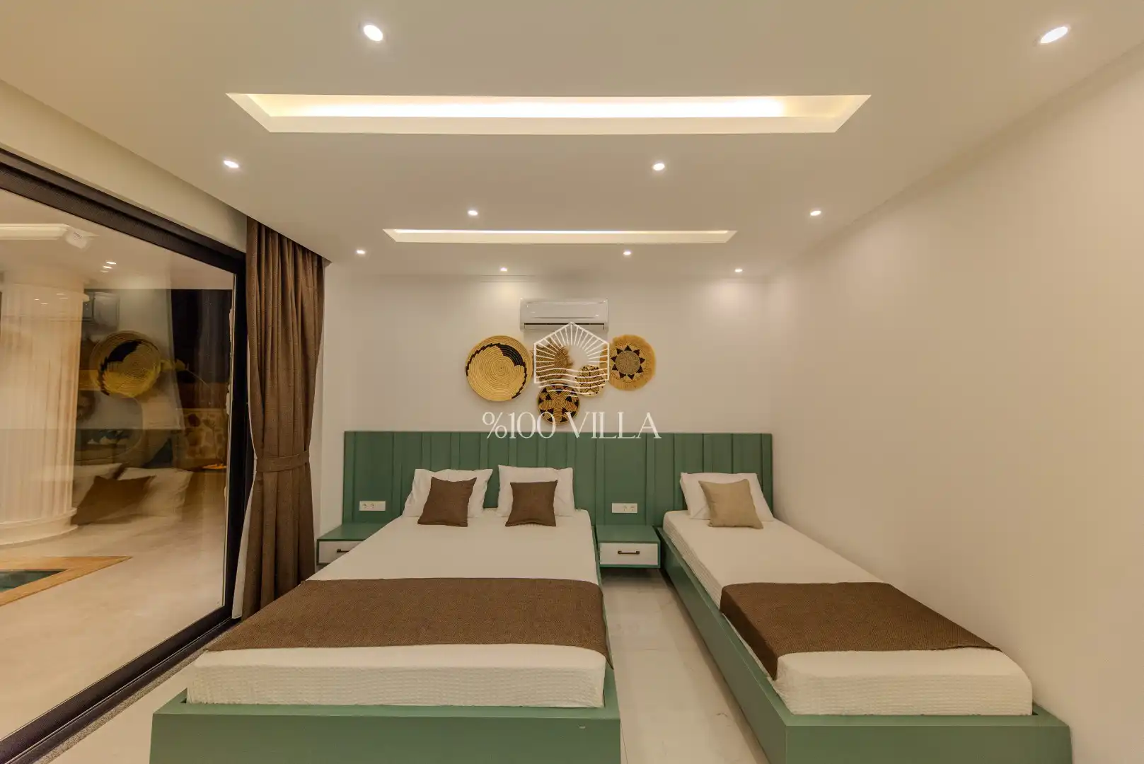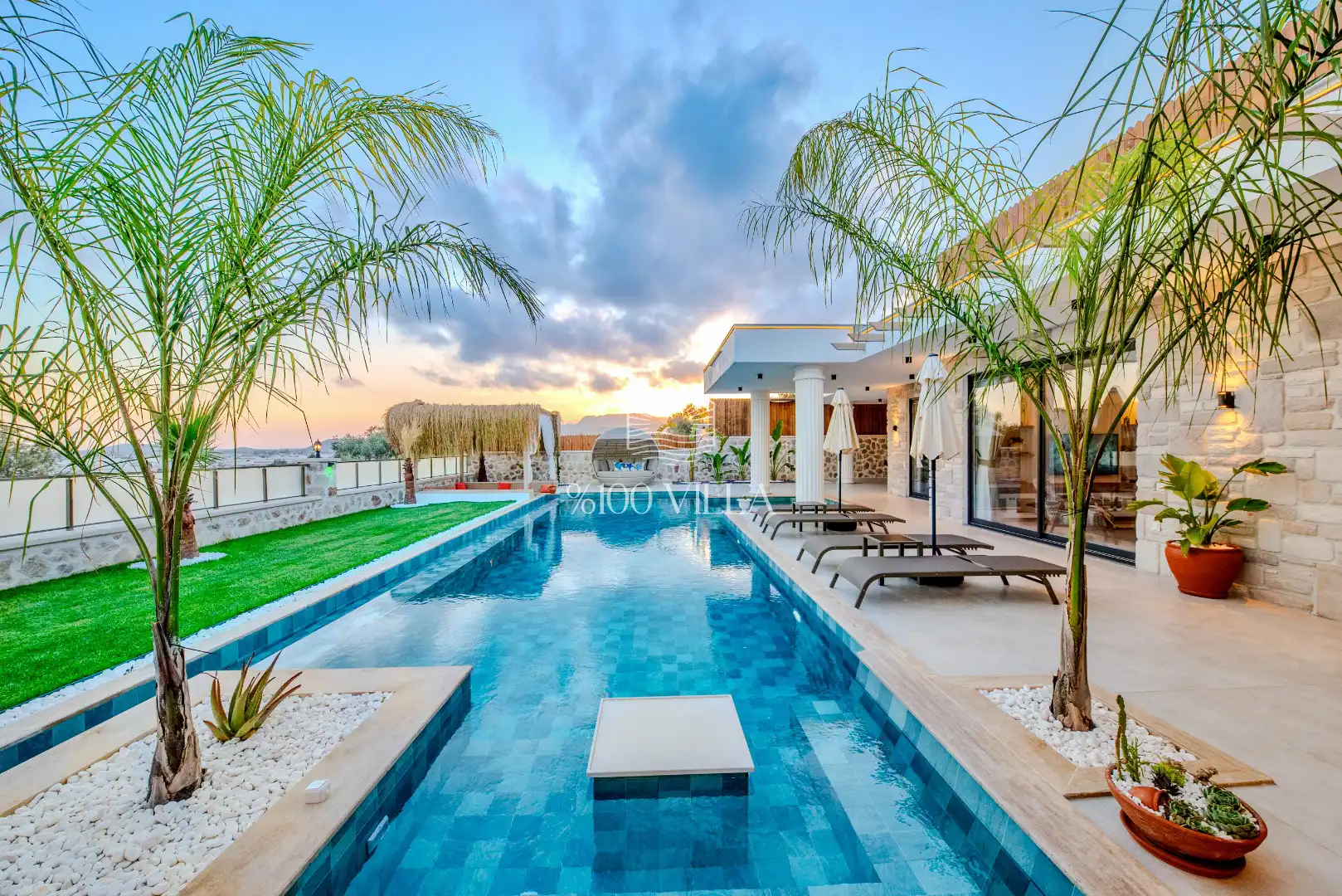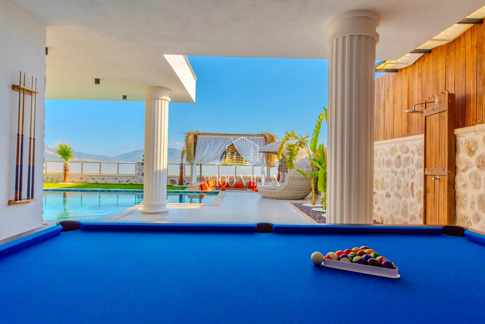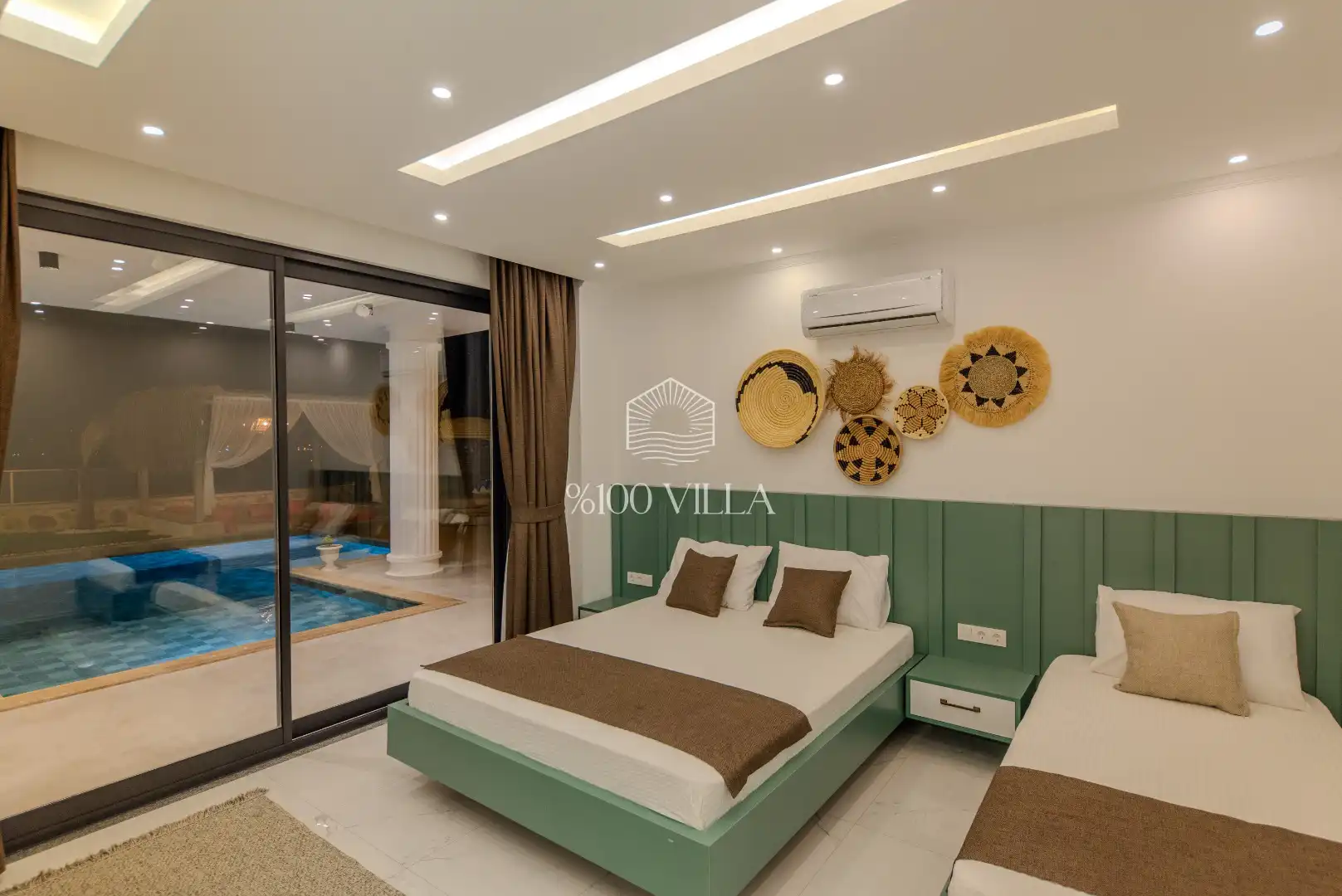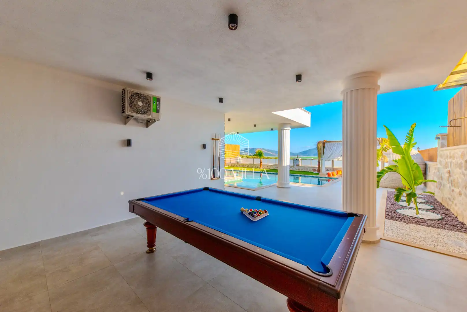 Şehirden uzak, lüks ve konforu bir arada deneyimleyebileceğiniz kriterlere ve olanaklara sahip villa; doğayla iç içe konumu ve tatilinize renk katacak havuz terasında kapasiteye uygun şezlong takımı, salıncak, çocuk oyun ekipmanları, masa tenisi, bilardo, oturma grubu ve barbekü alanı ile keyifli bir alana sahiptir. Geniş havuz ve bahçeye açılan konforlu oturma odası ve tam donanımlı açık mutfağı; birinci yatak odasında çift kişilik yatak, ebeveyn banyosu ve jakuzi; ikinci yatak odasında ise bir tek kişilik yatak, bir çift kişilik yatak, jakuzi ve banyo bulunmaktadır.