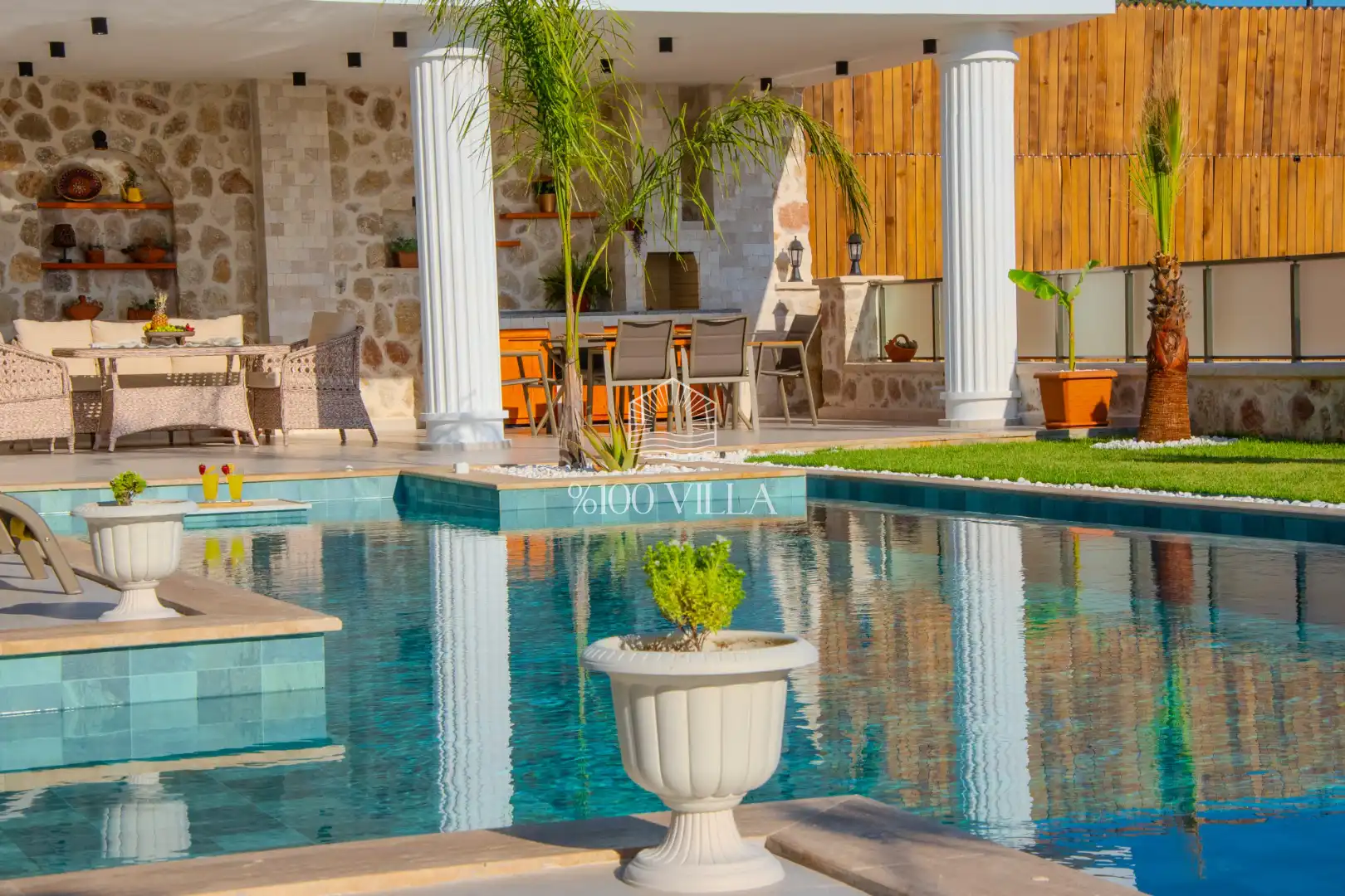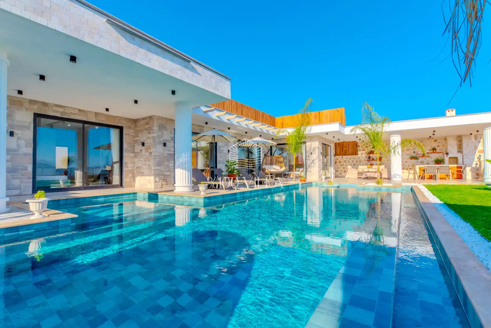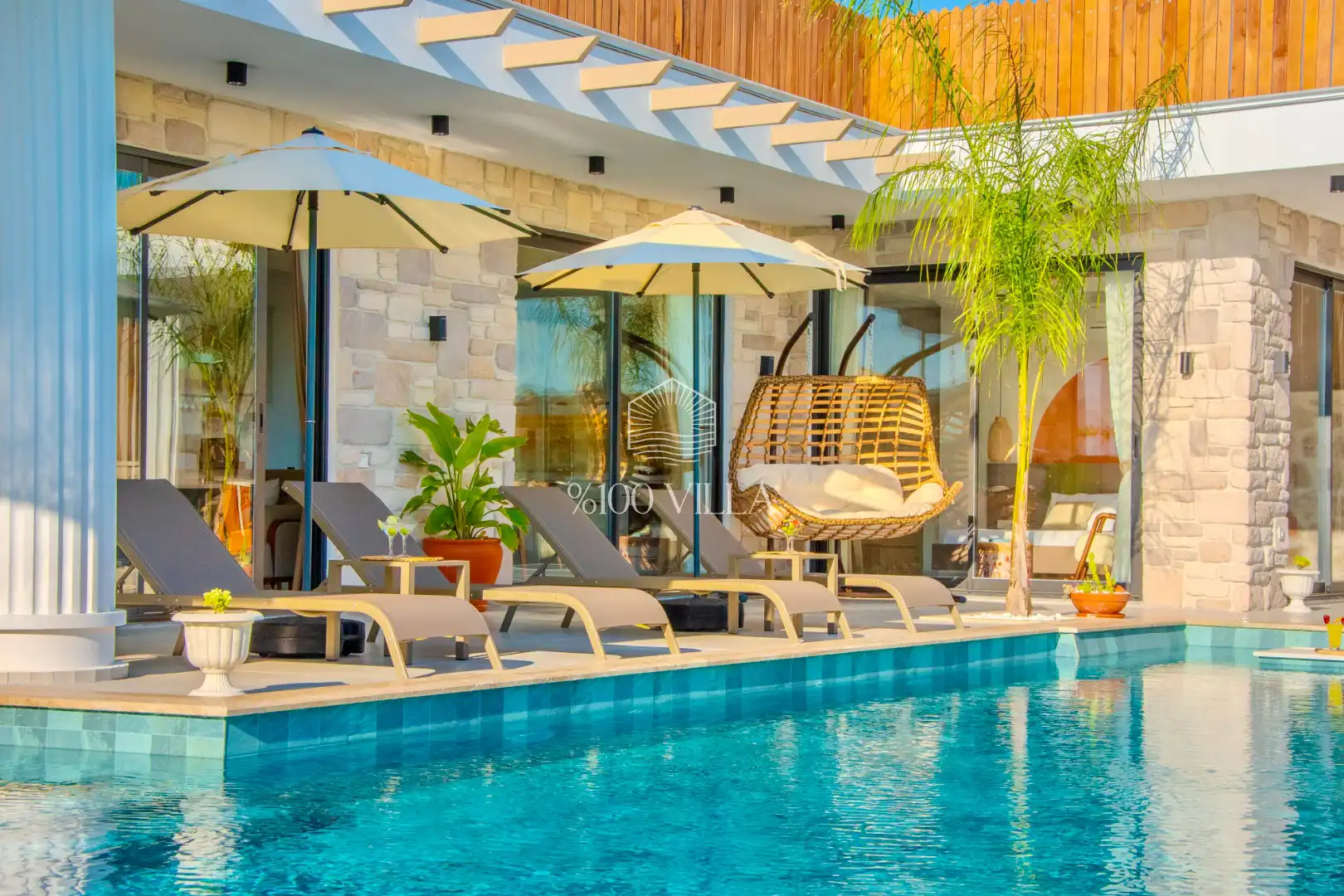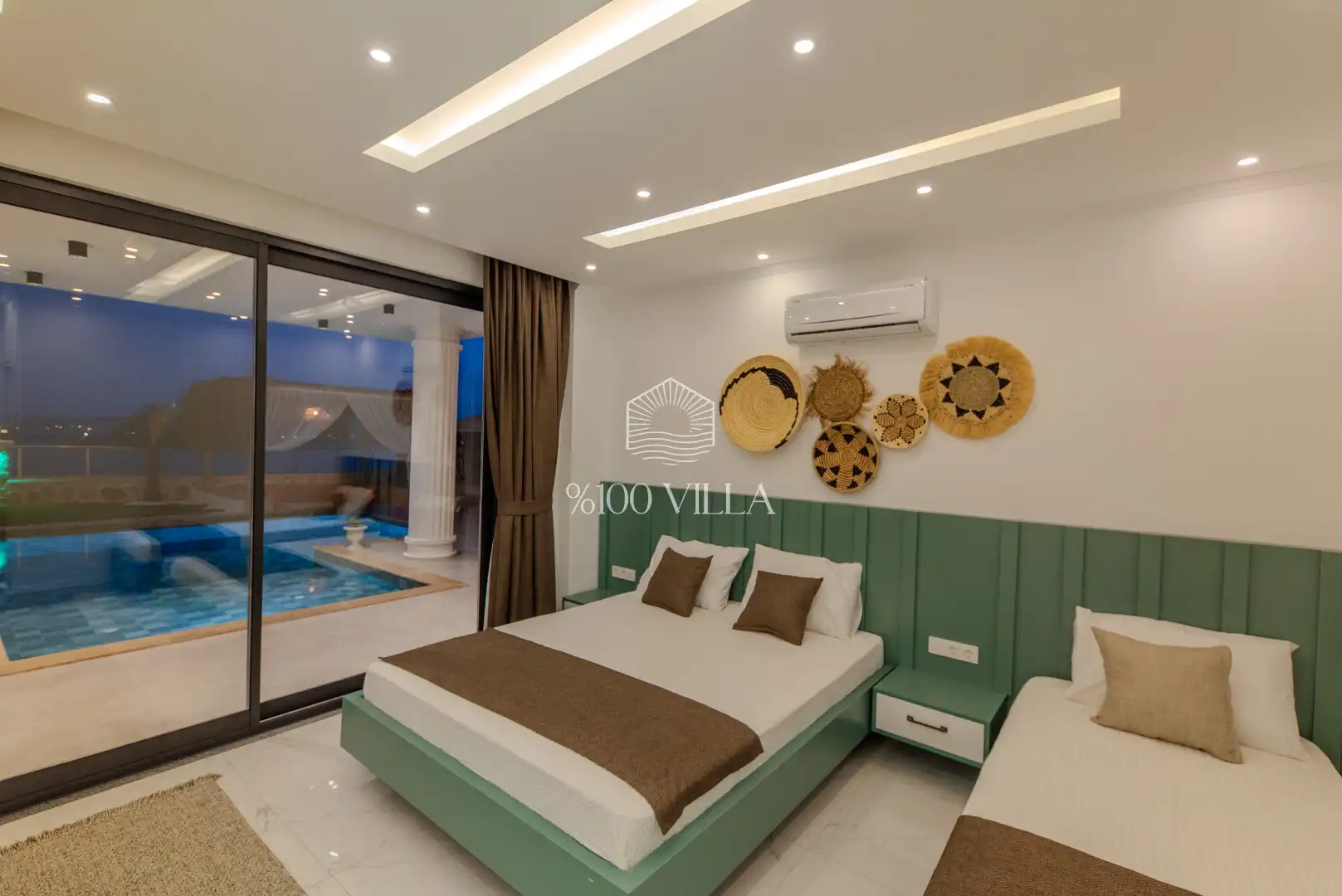 Şehirden uzak, lüks ve konforu bir arada deneyimleyebileceğiniz kriterlere ve olanaklara sahip villa; doğayla iç içe konumu ve tatilinize renk katacak havuz terasında kapasiteye uygun şezlong takımı, salıncak, çocuk oyun ekipmanları, masa tenisi, bilardo, oturma grubu ve barbekü alanı ile keyifli bir alana sahiptir. Geniş havuz ve bahçeye açılan konforlu oturma odası ve tam donanımlı açık mutfağı; birinci yatak odasında çift kişilik yatak, ebeveyn banyosu ve jakuzi; ikinci yatak odasında ise bir tek kişilik yatak, bir çift kişilik yatak, jakuzi ve banyo bulunmaktadır.