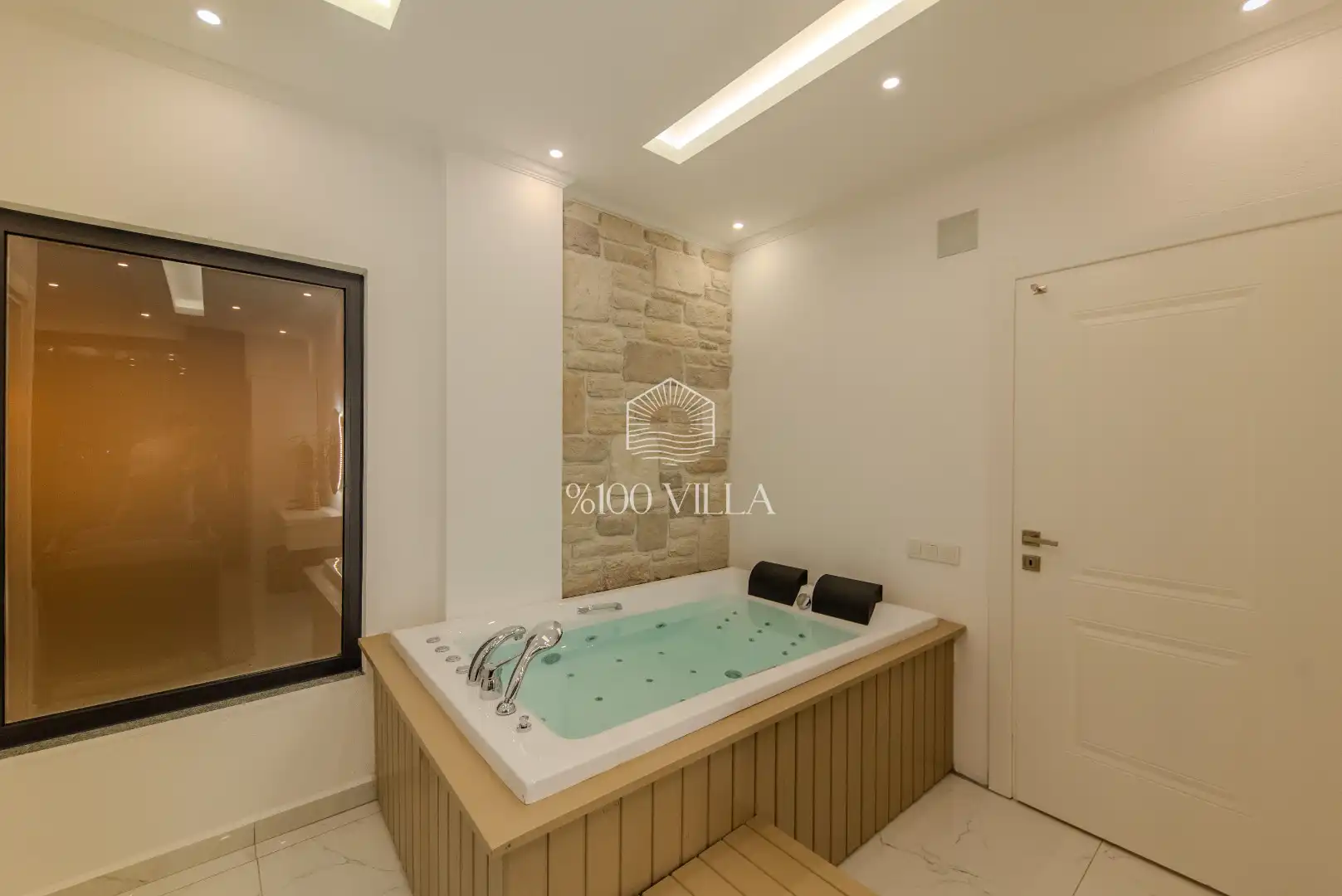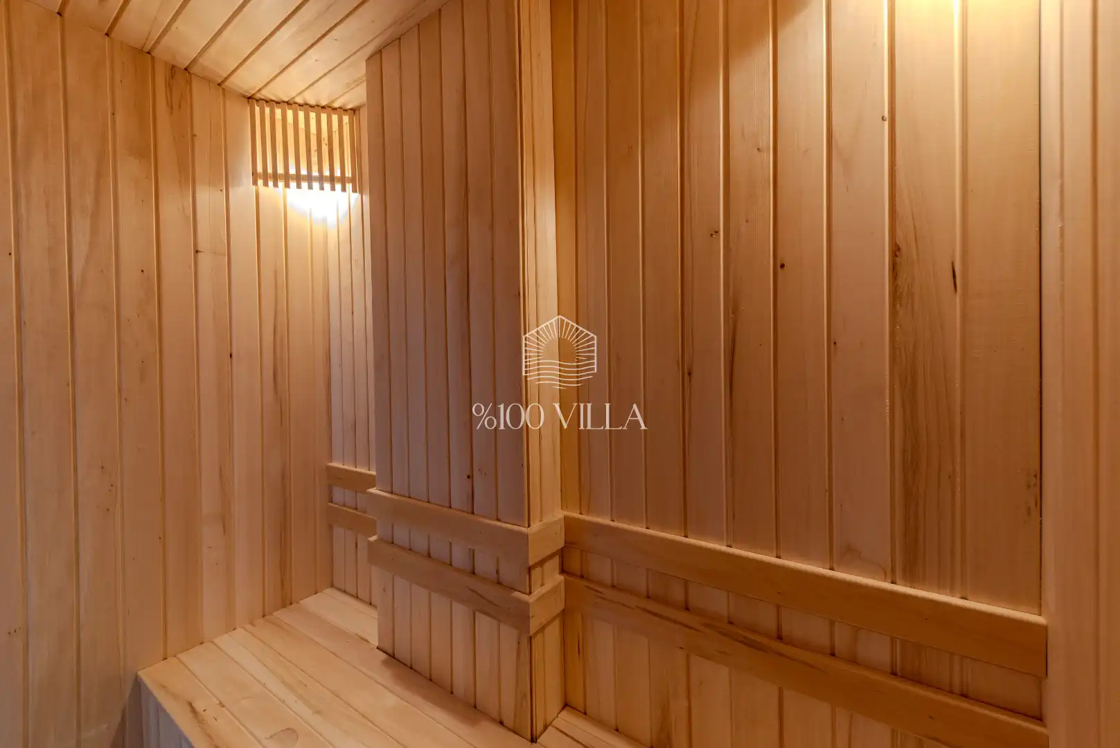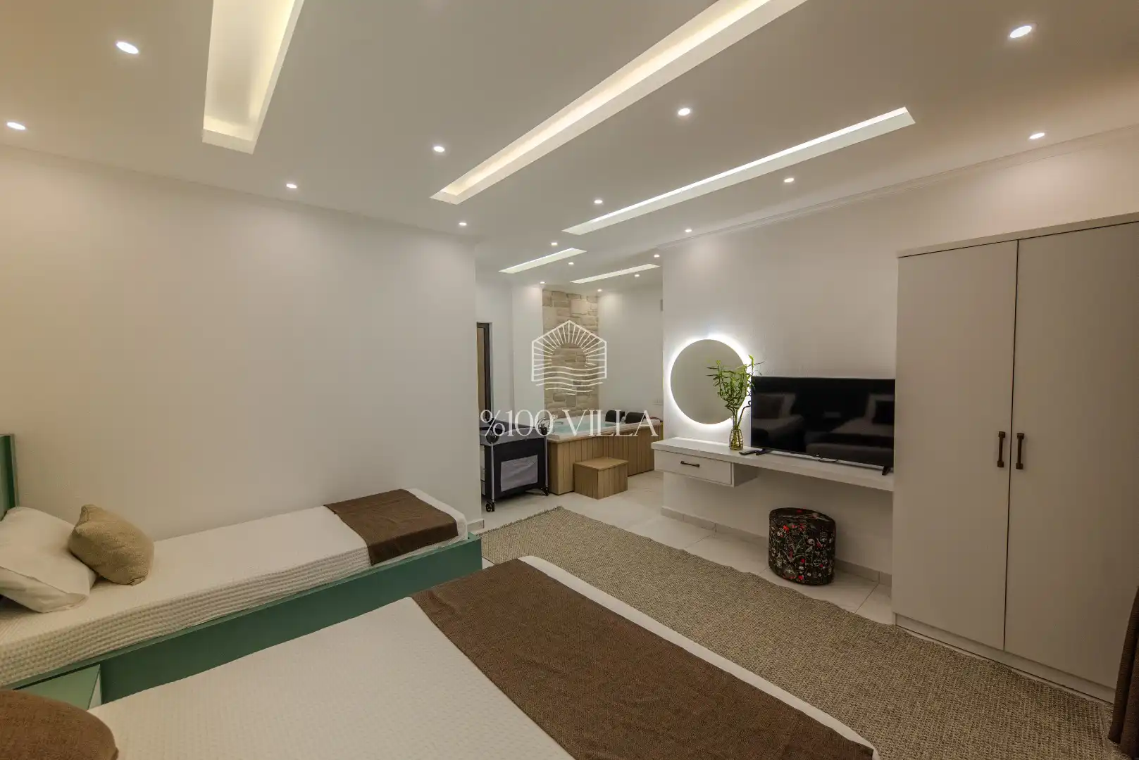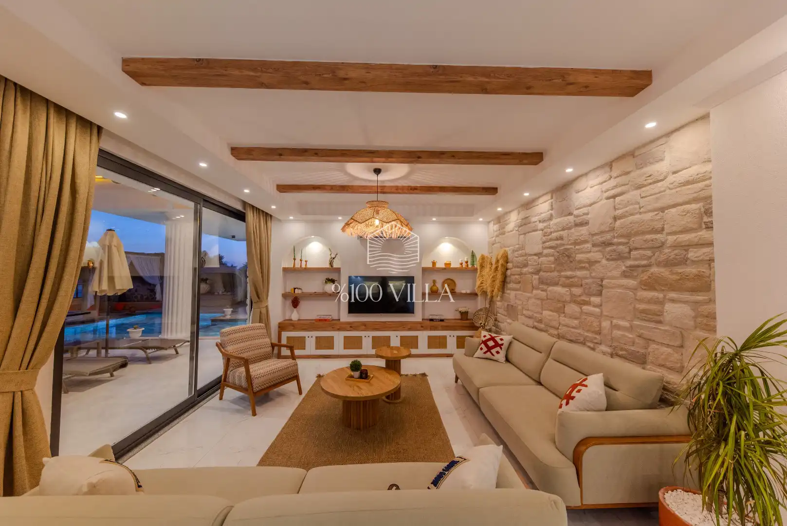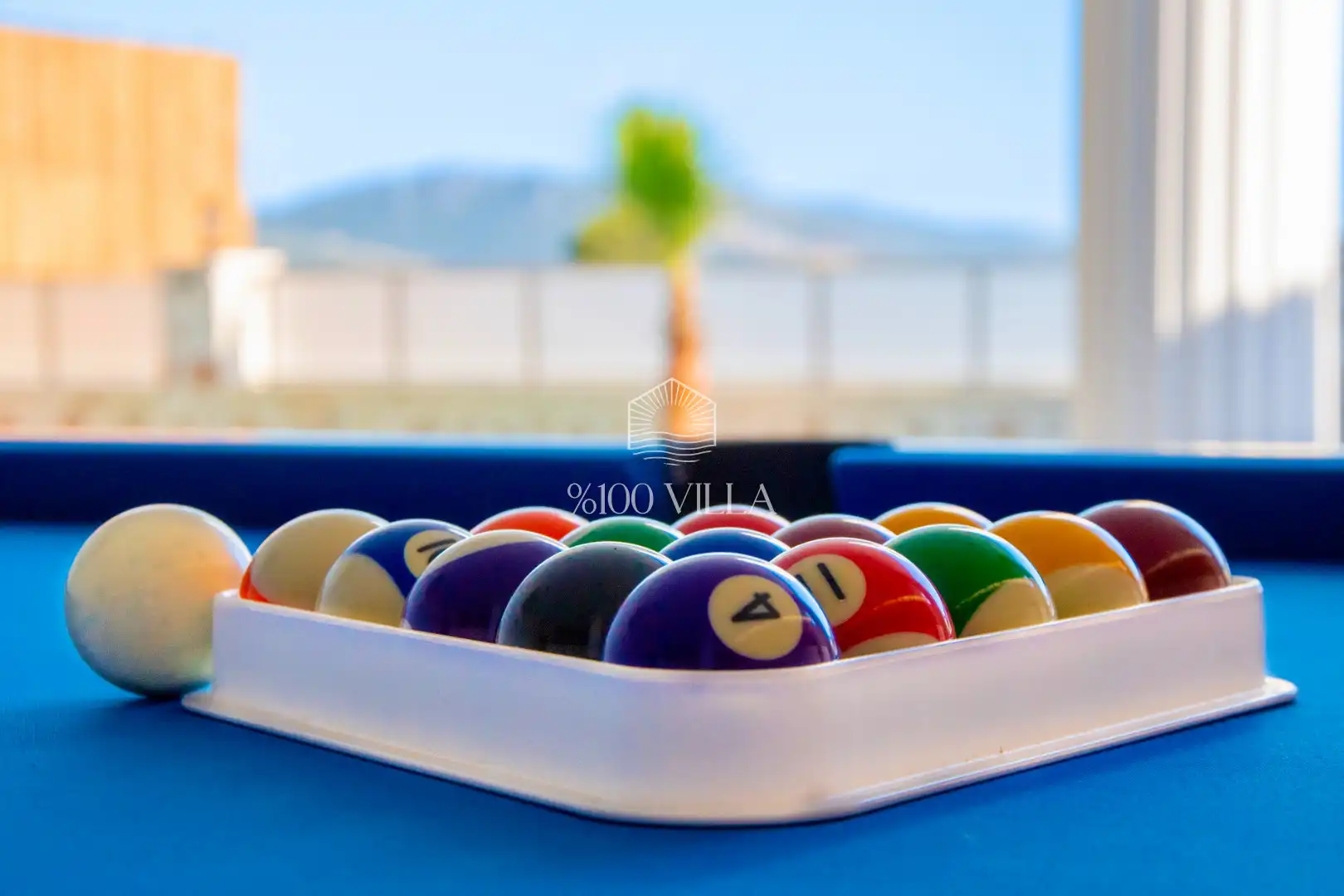 Şehirden uzak, lüks ve konforu bir arada deneyimleyebileceğiniz kriterlere ve olanaklara sahip villa; doğayla iç içe konumu ve tatilinize renk katacak havuz terasında kapasiteye uygun şezlong takımı, salıncak, çocuk oyun ekipmanları, masa tenisi, bilardo, oturma grubu ve barbekü alanı ile keyifli bir alana sahiptir. Geniş havuz ve bahçeye açılan konforlu oturma odası ve tam donanımlı açık mutfağı; birinci yatak odasında çift kişilik yatak, ebeveyn banyosu ve jakuzi; ikinci yatak odasında ise bir tek kişilik yatak, bir çift kişilik yatak, jakuzi ve banyo bulunmaktadır.