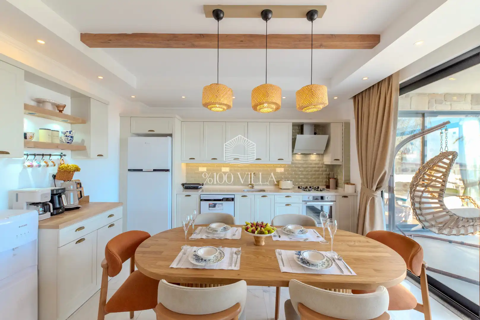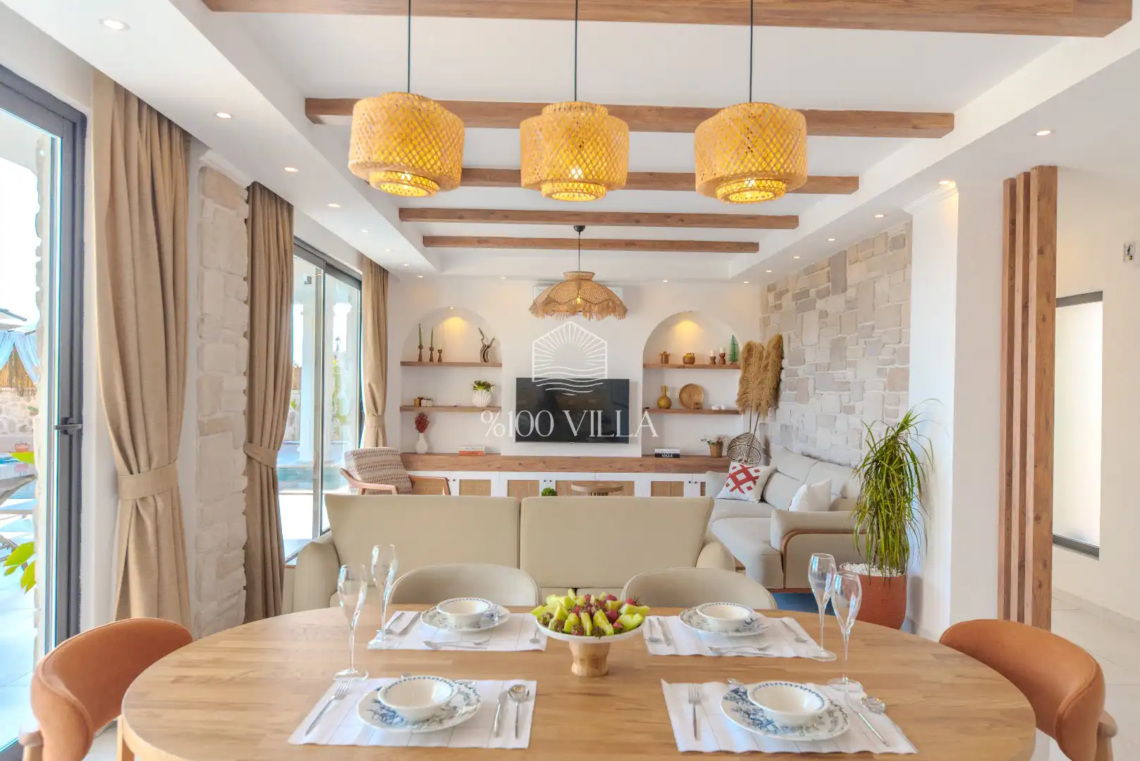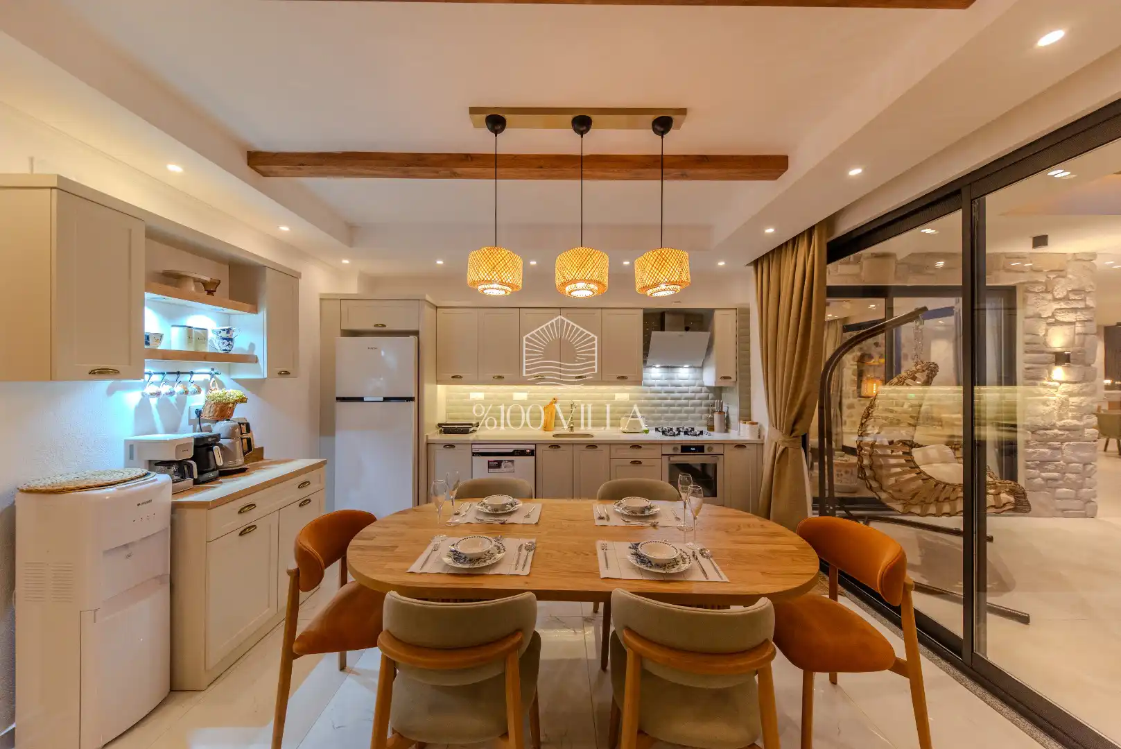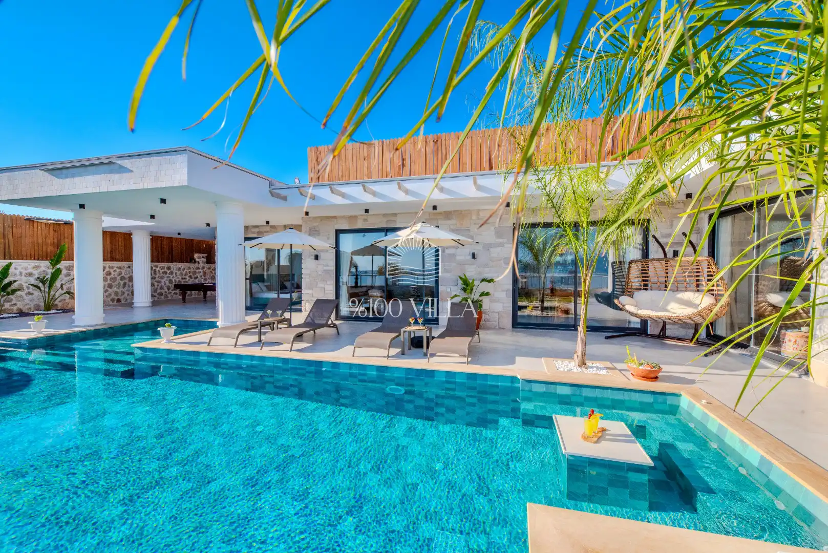 Şehirden uzak, lüks ve konforu bir arada deneyimleyebileceğiniz kriterlere ve olanaklara sahip villa; doğayla iç içe konumu ve tatilinize renk katacak havuz terasında kapasiteye uygun şezlong takımı, salıncak, çocuk oyun ekipmanları, masa tenisi, bilardo, oturma grubu ve barbekü alanı ile keyifli bir alana sahiptir. Geniş havuz ve bahçeye açılan konforlu oturma odası ve tam donanımlı açık mutfağı; birinci yatak odasında çift kişilik yatak, ebeveyn banyosu ve jakuzi; ikinci yatak odasında ise bir tek kişilik yatak, bir çift kişilik yatak, jakuzi ve banyo bulunmaktadır.