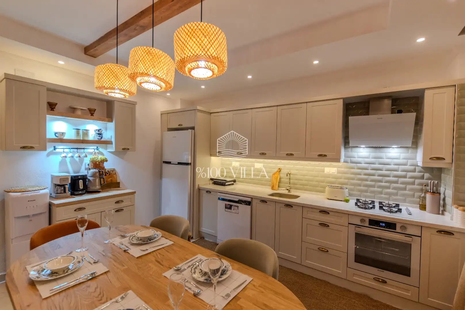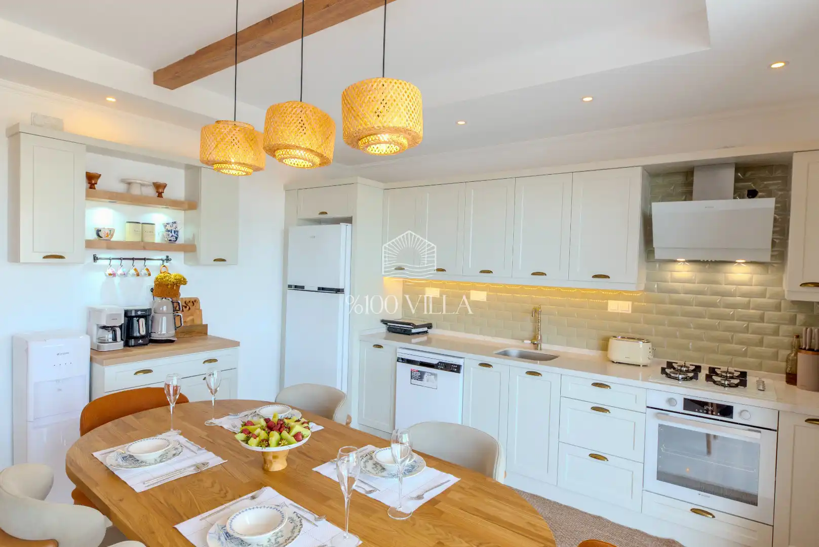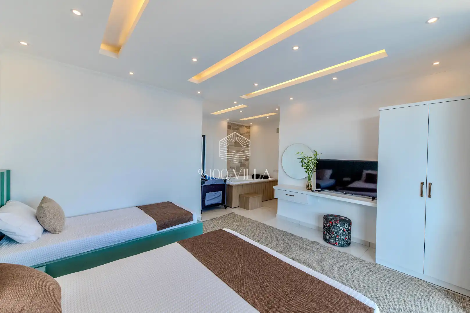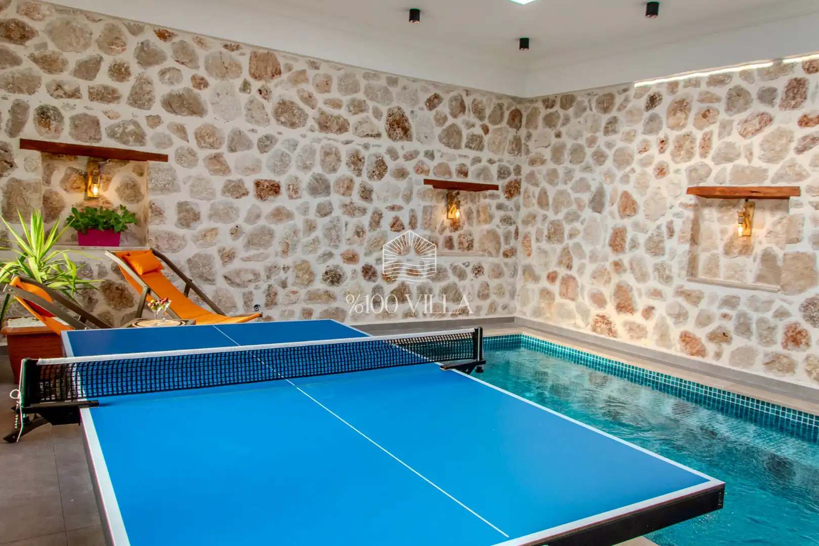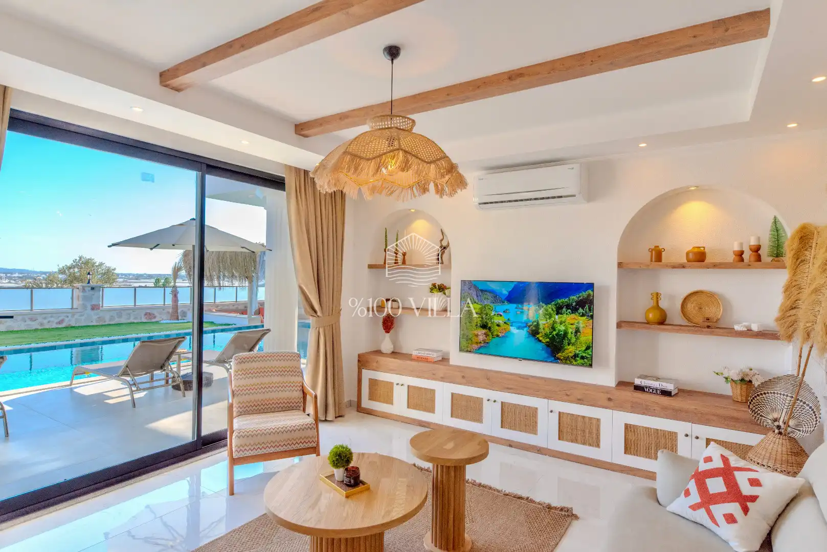 Şehirden uzak, lüks ve konforu bir arada deneyimleyebileceğiniz kriterlere ve olanaklara sahip villa; doğayla iç içe konumu ve tatilinize renk katacak havuz terasında kapasiteye uygun şezlong takımı, salıncak, çocuk oyun ekipmanları, masa tenisi, bilardo, oturma grubu ve barbekü alanı ile keyifli bir alana sahiptir. Geniş havuz ve bahçeye açılan konforlu oturma odası ve tam donanımlı açık mutfağı; birinci yatak odasında çift kişilik yatak, ebeveyn banyosu ve jakuzi; ikinci yatak odasında ise bir tek kişilik yatak, bir çift kişilik yatak, jakuzi ve banyo bulunmaktadır.
