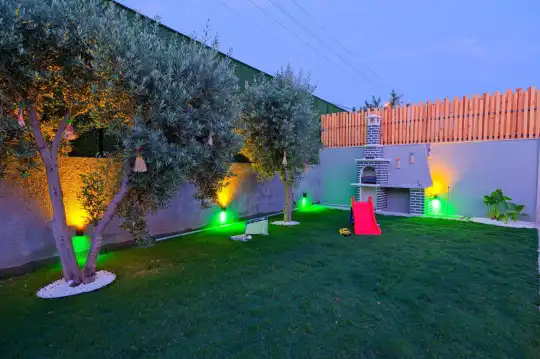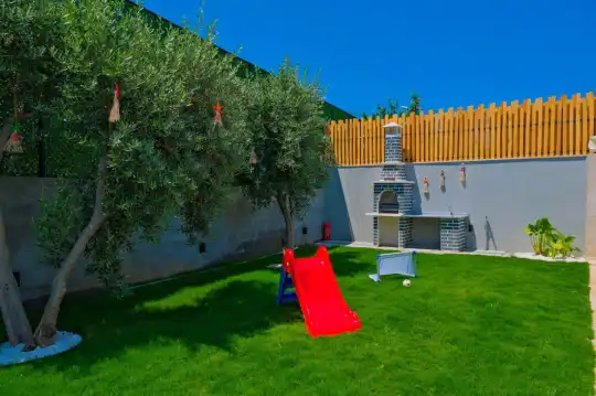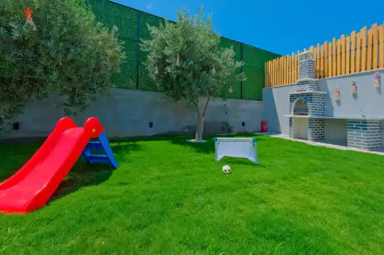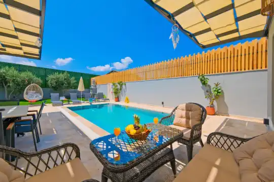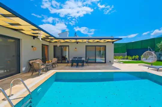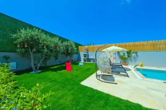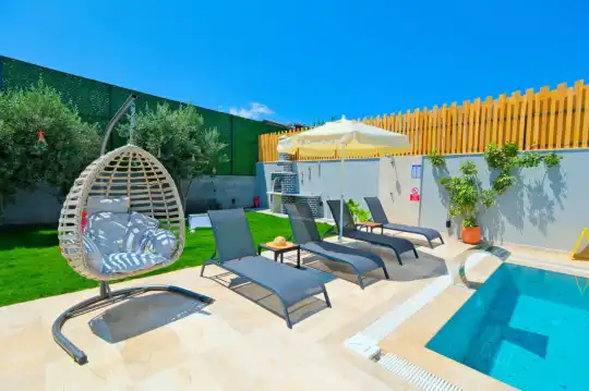 Merkezi konumuyla tercih edilen villa, geniş ve ferah bahçesiyle dikkat çeker. Bahçede kapasiteye uygun şezlonglar, oturma grubu, salıncak ve barbekü alanı bulunmaktadır. Havuz terasına açılan, zevkle döşenmiş oturma odası ve tam donanımlı mutfak, misafirlerin her ihtiyacını karşılayacak şekilde tasarlanmıştır. Bir yatak odasında çift kişilik yatak ve ebeveyn banyosu, diğer yatak odasında ise iki tek kişilik yatak ve bir ebeveyn banyosu bulunmaktadır. Bahçe alanı, içerisi kadar özenle dizayn edilmiştir.