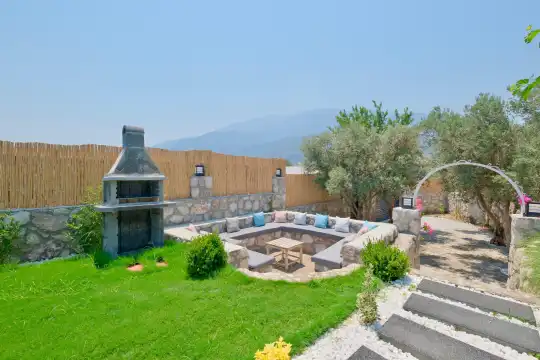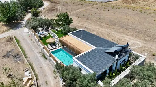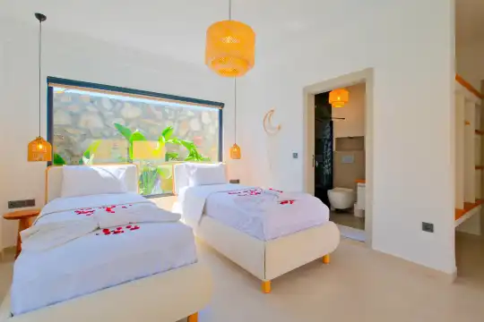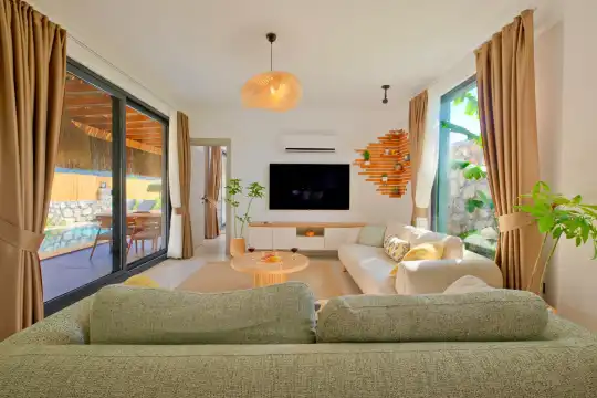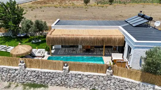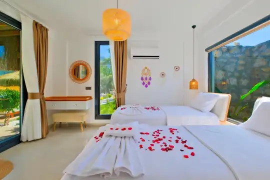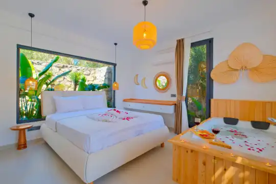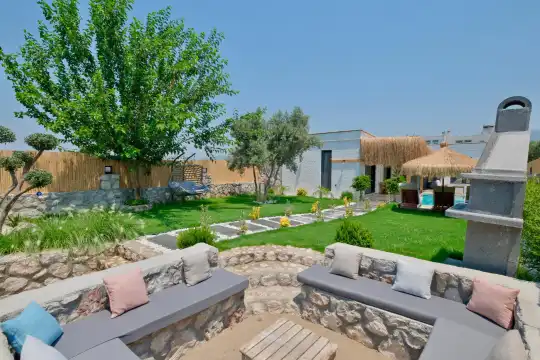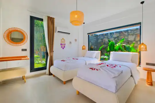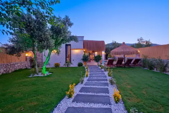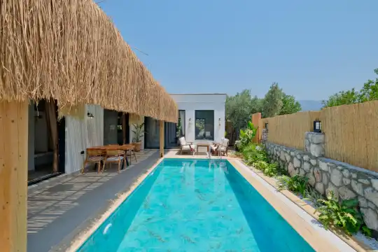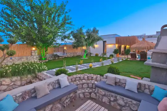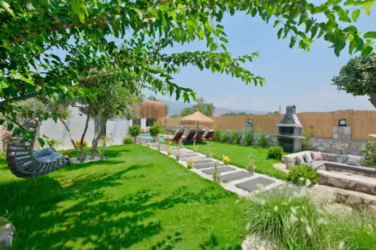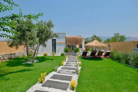 Geniş ve ferah bahçesi, modern mimarisiyle dikkat çeken villa, misafirlerine konforlu bir açık alan sunar. Bahçede şezlong takımları, oturma grubu, salıncak ve barbekü alanı bulunmaktadır. Havuz terasına açılan özenle dekore edilmiş oturma odası ve tam donanımlı mutfak, konforlu bir yaşam alanı sağlar. Villanın bir yatak odasında çift kişilik yatak, ebeveyn banyosu ve jakuzi; diğer yatak odasında ise iki tek kişilik yatak ve ebeveyn banyosu yer almaktadır. Bahçe alanı, iç mekânın estetik çizgilerini devam ettiren bir şekilde tasarlanmıştır.