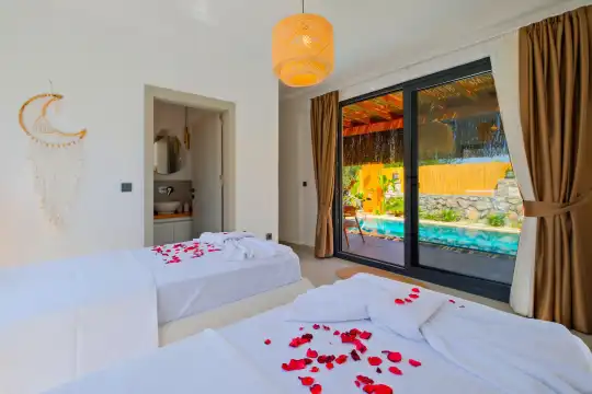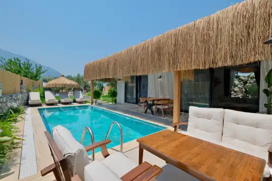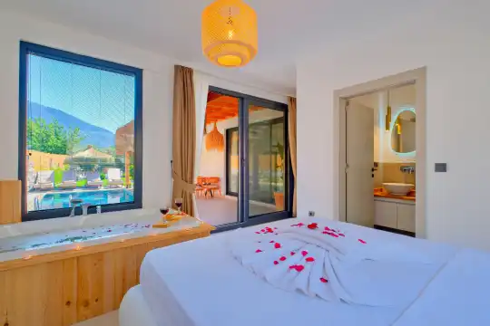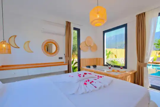 Fethiye Karaçulha bölgesinde yer alan bu villa, 2 yatak odasıyla 4 kişiye kadar konaklama imkânı sunmaktadır. Ailelerin ve balayı çiftlerinin favorisi olan villa, korunaklı havuz alanıyla mahremiyeti ön planda tutmaktadır. Şık ve modern tasarımıyla unutulmaz bir tatil deneyimi için ideal bir ortam sağlar.