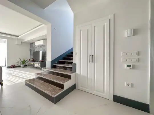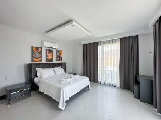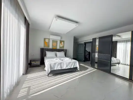 İç mekanında ferah bir oturma odası, donanımlı mutfak ve üç yatak odasında çift kişilik yataklarla, her odada banyo imkanı sunulmuş. Ayrıca, dördüncü odada ise iki tek kişilik yatak ve ebeveyn banyosu mevcut. Tatiliniz boyunca rahatlık ve konforun keyfini çıkarabileceğiniz her detay düşünülmüş.