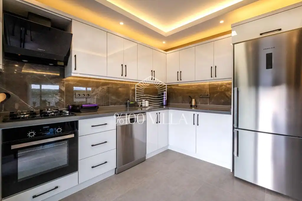 Villanın tam donanımlı mutfağında buzdolabı, ankastre ocak ve fırın, mikrodalga fırın, tost makinesi, çamaşır makinesi ve ihtiyaç duyabileceğiniz temel mutfak ekipmanları yer almaktadır. Bu sayede tatiliniz boyunca ev konforunda bir konaklama deneyimi yaşayabilirsiniz.