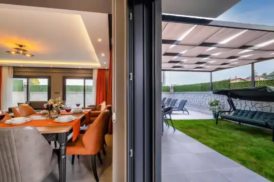 Villanın dış alanında yaklaşık 7 x 3,5 metre ölçülerinde özel yüzme havuzu bulunmaktadır. Geniş havuz terasında şezlonglar, şemsiye, veranda oturma alanı, bahçe yemek masası, barbekü / mangal alanı ve köşk (kamelya) gibi detaylar yer alır. Bu alan, misafirlerin gün boyu keyifli vakit geçirebileceği şekilde tasarlanmıştır. Ayrıca Villa Gök 1’in havuz ve bahçe alanı korunaklı olup dışarıdan görünmemektedir, bu da özellikle muhafazakâr aileler için avantaj sağlamaktadır.
