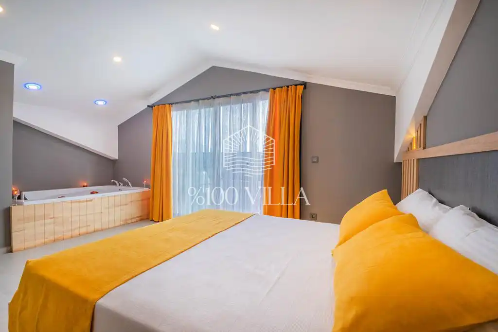 Villanın dış alanında yaklaşık 7 x 3,5 metre ölçülerinde özel yüzme havuzu bulunmaktadır. Geniş havuz terasında şezlonglar, şemsiye, veranda oturma alanı, bahçe yemek masası, barbekü / mangal alanı ve köşk (kamelya) gibi detaylar yer alır. Bu alan, misafirlerin gün boyu keyifli vakit geçirebileceği şekilde tasarlanmıştır. Ayrıca Villa Gök 2’in havuz ve bahçe alanı korunaklı olup dışarıdan görünmemektedir, bu da özellikle muhafazakâr aileler için avantaj sağlamaktadır.