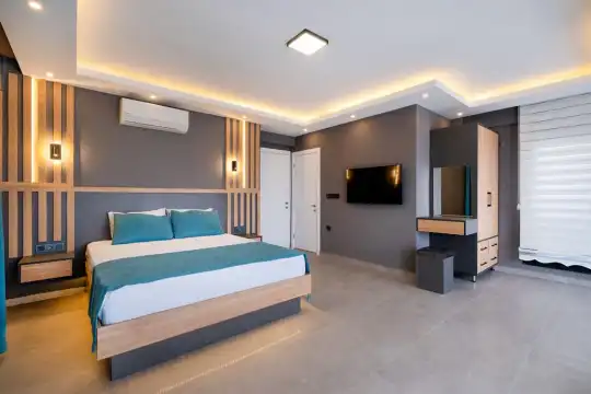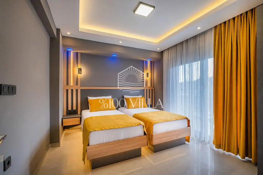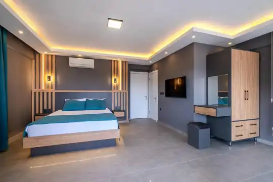 Villa Gök 2’in iç mekânında toplam 4 yatak odası bulunmaktadır. İki yatak odasında çift kişilik yatak, diğer iki yatak odasında ise ikişer adet tek kişilik yatak yer almaktadır. Tüm odalarda klima, elbise dolabı, komodin ve özel banyo/WC gibi konforlu detaylar düşünülmüştür. Modern tasarıma sahip açık plan salon ve mutfak alanı, rahat oturma grubu, TV, klima, yemek masası ve havuz terasına doğrudan çıkış imkânı sunarak keyifli bir yaşam alanı oluşturur.