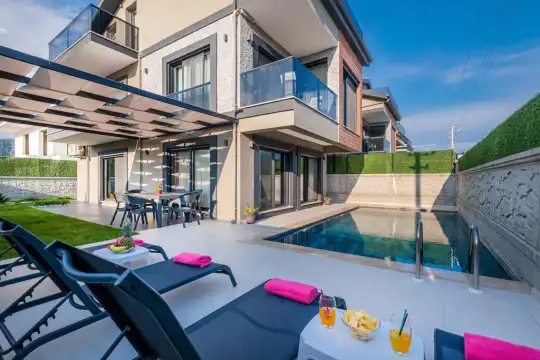 Muğla’nın gözde tatil destinasyonlarından Fethiye / Çalış bölgesinde konumlanan Villa Gök 2, özel havuzlu kiralık villalar arasında öne çıkan konforlu bir tatil seçeneğidir. Geniş aileler ve arkadaş grupları için ideal olan villamız, 4 yatak odası ve 8 kişilik konaklama kapasitesi ile ferah ve keyifli bir tatil imkânı sunmaktadır. 2023 yılında modern mimari ve şık iç tasarım anlayışıyla hazırlanmış olan villa, sessiz ve sakin bir konumda yer alarak misafirlerine dinlendirici bir tatil deneyimi sağlar.