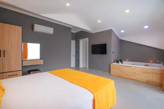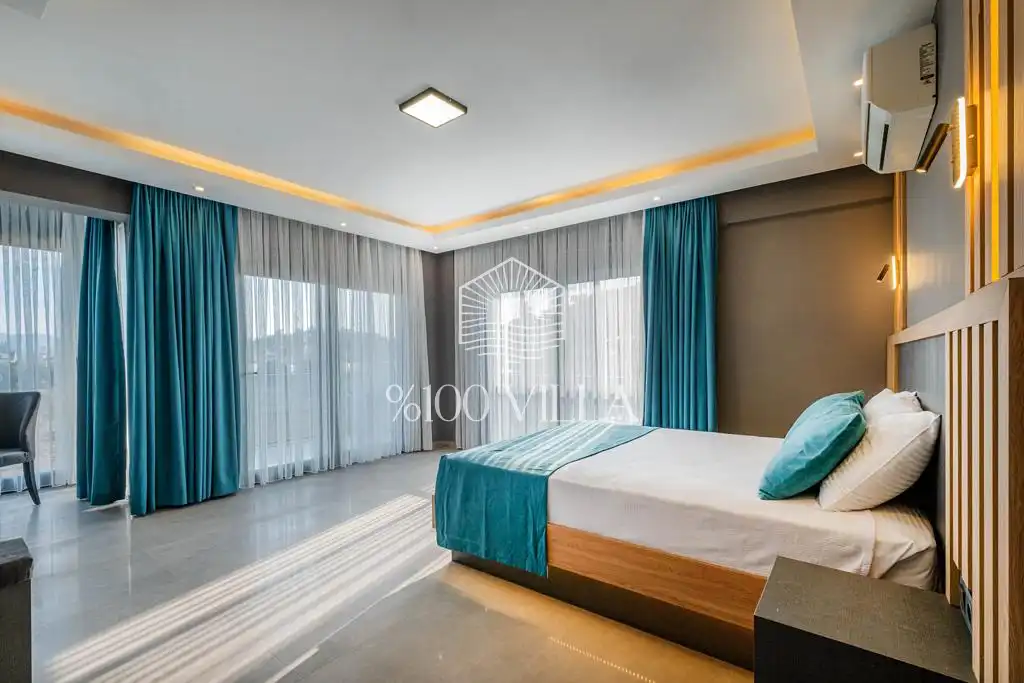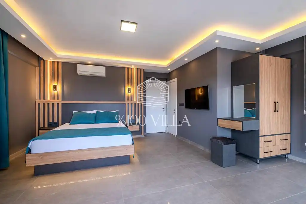 Villa Gök 3’in iç mekânında toplam 4 yatak odası bulunmaktadır. İki yatak odasında çift kişilik yatak, diğer iki yatak odasında ise ikişer adet tek kişilik yatak yer almaktadır. Tüm odalarda klima, elbise dolabı, komodin ve özel banyo/WC gibi konforlu detaylar düşünülmüştür. Modern tasarıma sahip açık plan salon ve mutfak alanı, rahat oturma grubu, TV, klima, yemek masası ve havuz terasına doğrudan çıkış imkânı sunarak keyifli bir yaşam alanı oluşturur.