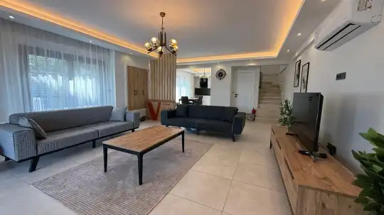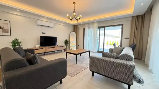 Modern oturma grubu, 6 kişilik yemek masası ve sandalyeler, klima, lavabo/WC, TV ve uydu alıcısı ile donatılmıştır. Salondan havuz alanına direkt çıkış yapılabilmektedir.