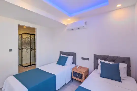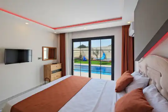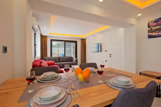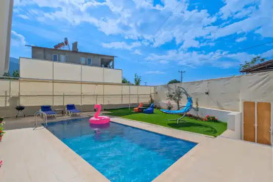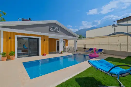 Fethiye Esenköy- Bozyer mevkiinde bulunan villa, 2 yatak odasıyla 4 kişilik konaklama kapasitesi sunmaktadır. Korunaklı havuz ve bahçe alanına sahip olan villa çekirdek aile ve balayı çiftleri için uygun seçenekler arasındadır. Açık mutfağı ve kendine ait bahçesinde bir havuzu var. Mutfağında bulaşık makinesi, buzdolabı, ankastre fırın, tost makinesi ve mutfakta ihtiyaç olan hemen hemen bütün gereçler bulunuyor. Barbekü, masa, sandalyeler, şezlonglar ve şemsiyeler bahçe keyfini sınırsız yaşamanıza imkan tanıyor. Salonunda oturma grubu, televizyon, eşyalar bulunurken, tüm odalar için ayrı klima imkanı var. Esenköy Mevkii, kalabalıktan uzaklaşmak isteyen, sakinlik arayanlar için oldukça ideal bir lokasyon. Doğayla iç içe, taze meyve ve sebzelere dalından ulaşılabilinen köy; yeşillikler arasında dingin bir tatil fırsatı sunuyor.