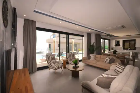 Modern ve şık bir dekorasyona sahip villamızın havuz alanına açılan ferah oturma odası ve tam donanımlı mutfağı, tatiliniz boyunca ihtiyacınız olan tüm konforu sağlar. İç mekan düzeni şu şekilde tasarlanmıştır: