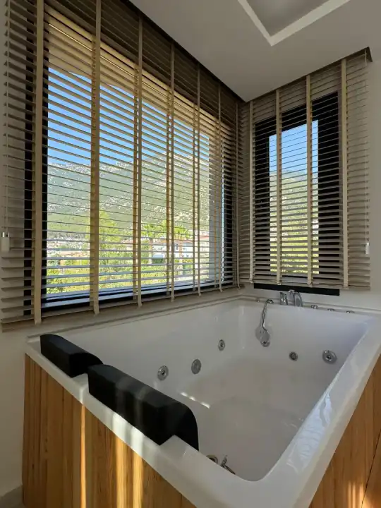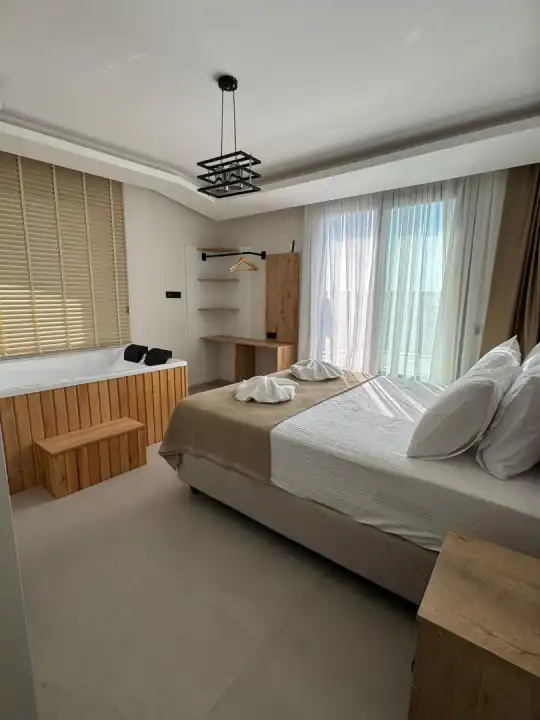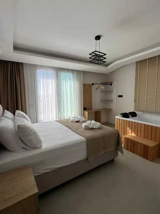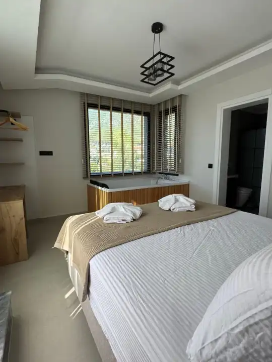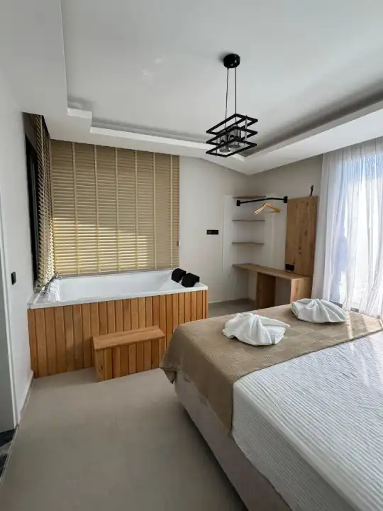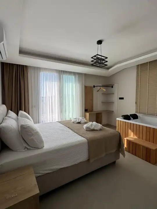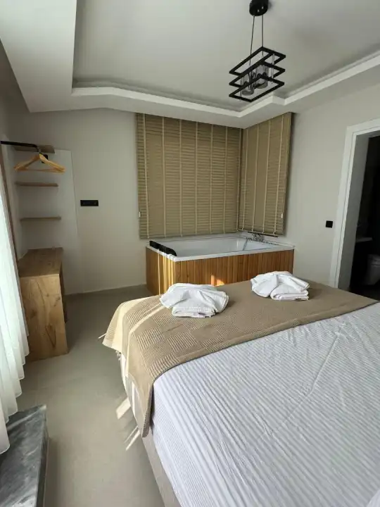 2. **Yatak Odası:** 1 adet çift kişilik yatak, jakuzi, klima ve ortak kullanımlı geniş teras.