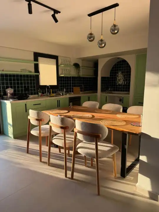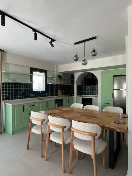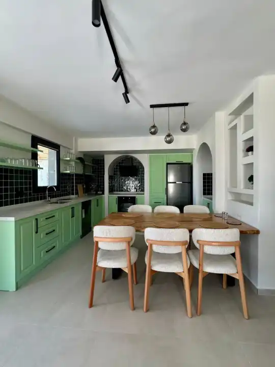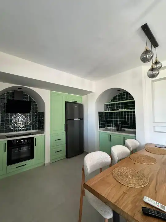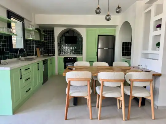 **Mutfak:** Donanımlı Amerikan mutfağında buzdolabı, bulaşık makinesi, fırın, mikrodalga ve çatal-bıçak seti bulunmaktadır.