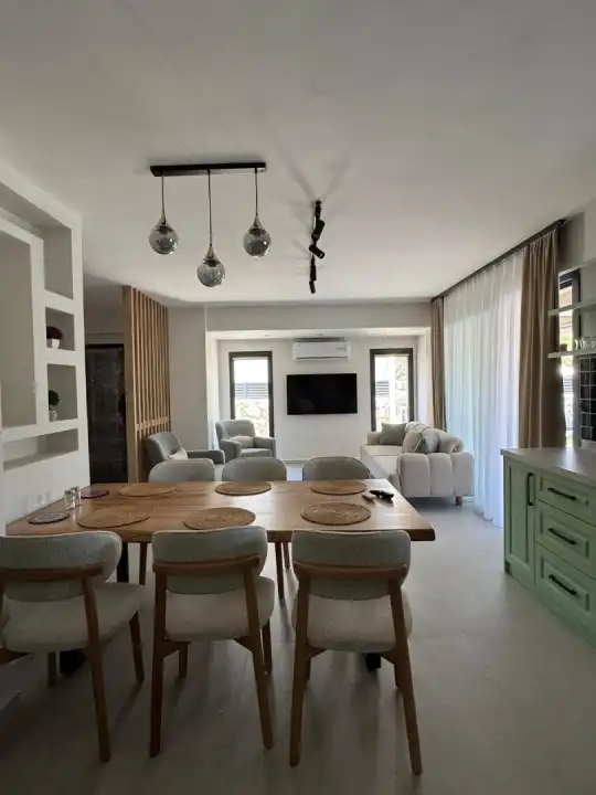 **Salon:** Modern oturma grubu, plazma TV, yemek masası ve direkt havuz alanına çıkış imkanı. Ortak kullanım WC mevcut.
