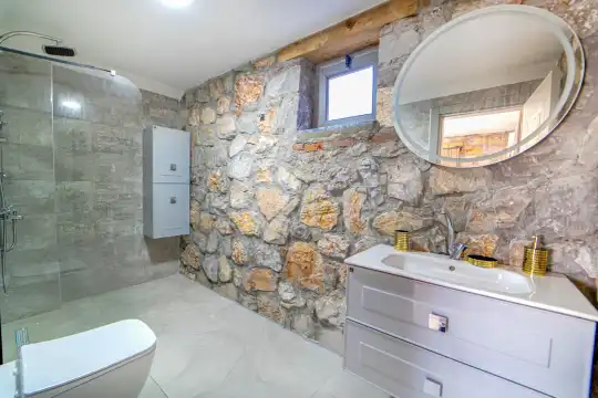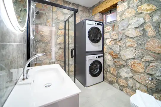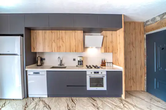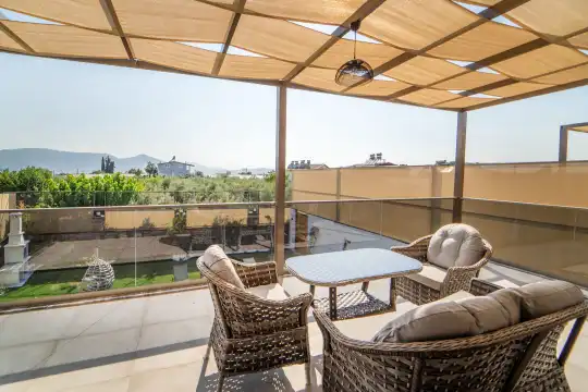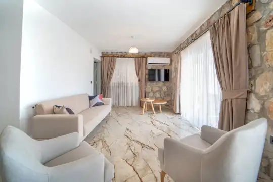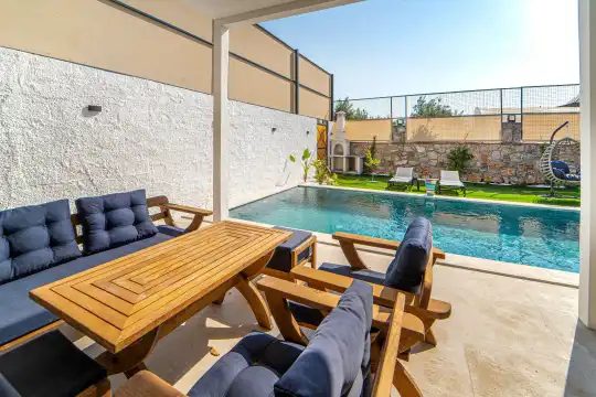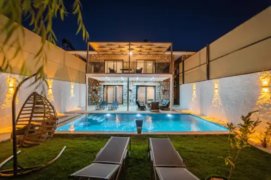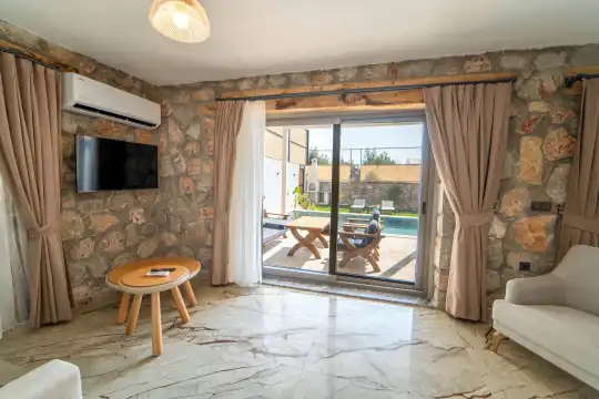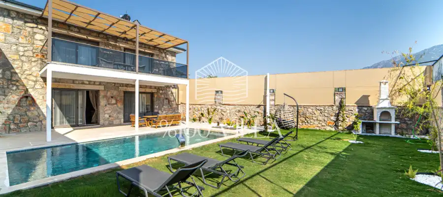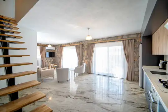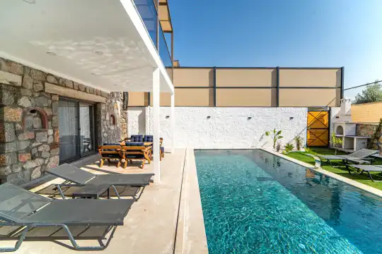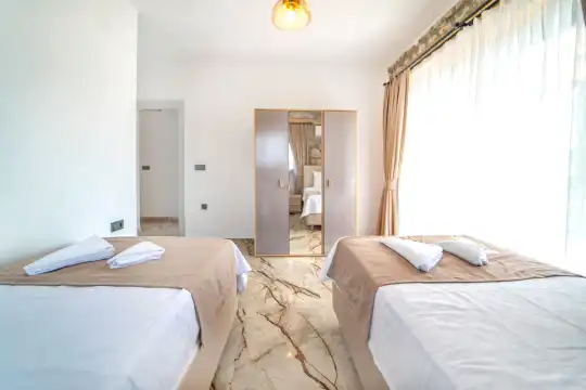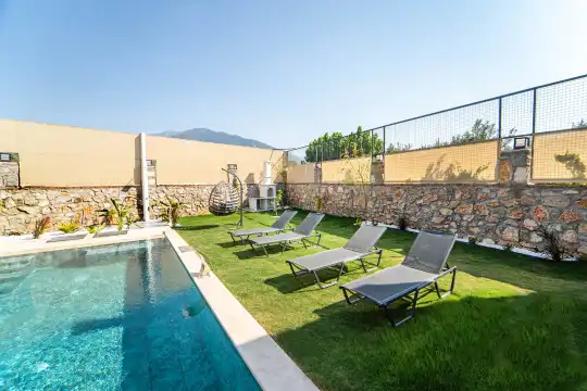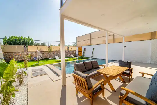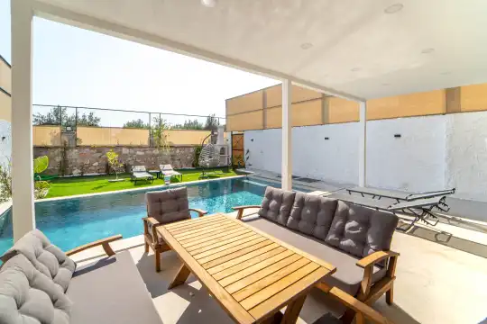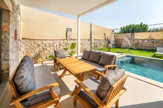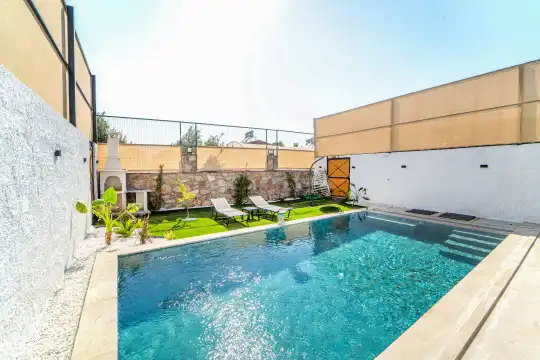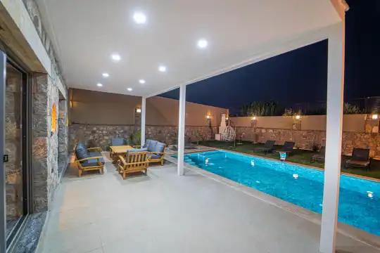 Geniş ve ferah bahçe alanı, konukların rahatça vakit geçirebileceği şekilde düzenlenmiştir. Bahçede, konforlu şezlonglar, oturma grubu ve barbekü alanı yer alarak keyifli anlar geçirmenizi sağlar. Havuz terasına açılan şık oturma odası, modern mutfak ile bir arada, ferah bir atmosfer sunmaktadır. Birinci yatak odasında çift kişilik yatak, ebeveyn banyosu ve jakuzi bulunurken; ikinci yatak odasında ise iki tek kişilik yatak ve ebeveyn banyosu mevcuttur. İç mekan tasarımı, konfor ve modernliği ön planda tutarak hazırlanmıştır.