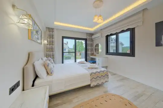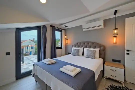 1. **Yatak Odası:** 1 adet çift kişilik yatak, klima ve geniş bir balkon. Ebeveyn banyo/WC mevcut.