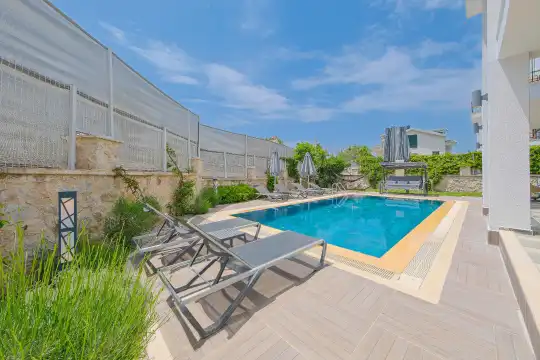 **Havuz:** 4 x 8 metre ebatlarında, 1.40 metre derinliğinde özel yüzme havuzu. Havuz kenarında şezlonglar ve salıncak yer almakta.