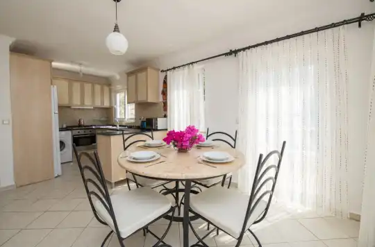 Villanın geniş ve modern oturma alanı doğrudan havuz terasına açılır. Bu bölümde iki adet üç kişilik kanepe, TV, yemek masası ve klima mevcuttur. Amerikan mutfak, tatilde ihtiyacınız olacak tüm ekipmanlara sahiptir. Yemek yaparken eşsiz manzaraya karşı zaman geçirmek bu villada ayrı bir keyif sunar.
